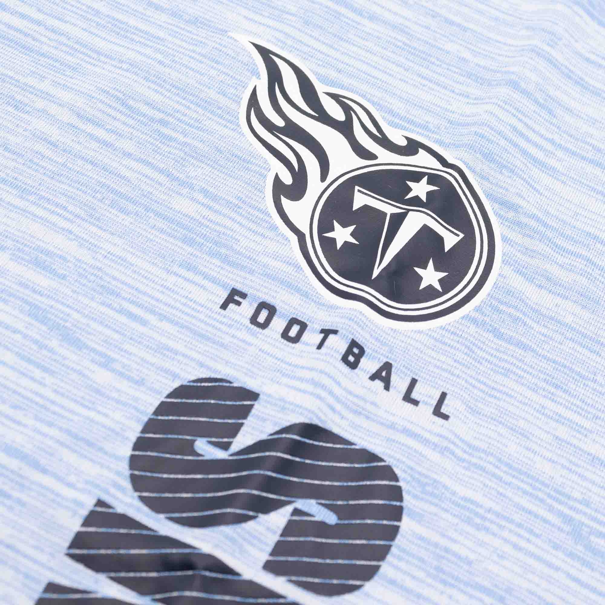 It features a large Tennessee Titans front print, the NFL Sideline Shield logo on the right sleeve, and the Nike Swoosh on the left. Made from lightweight and soft 100% performance polyester for optimal comfort.