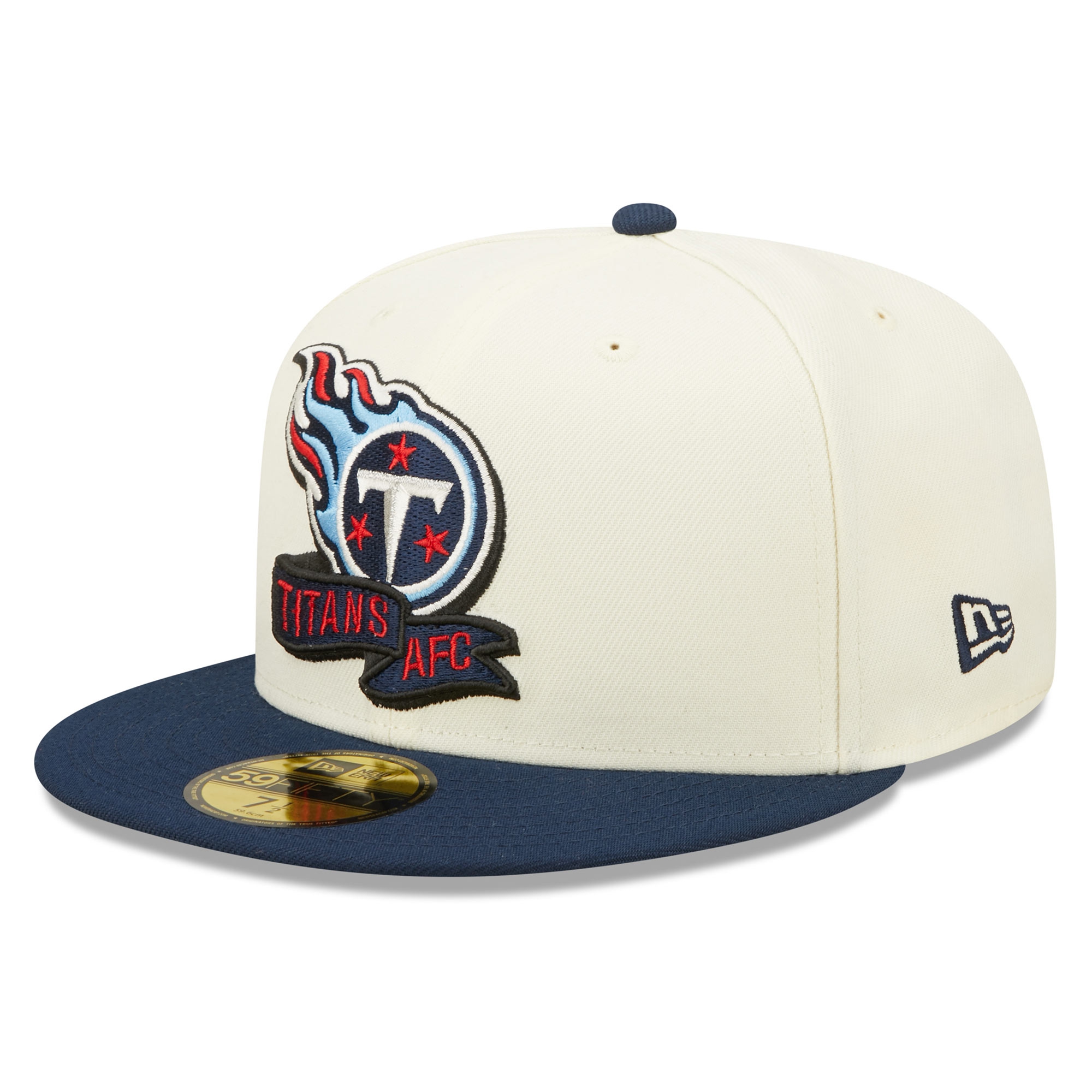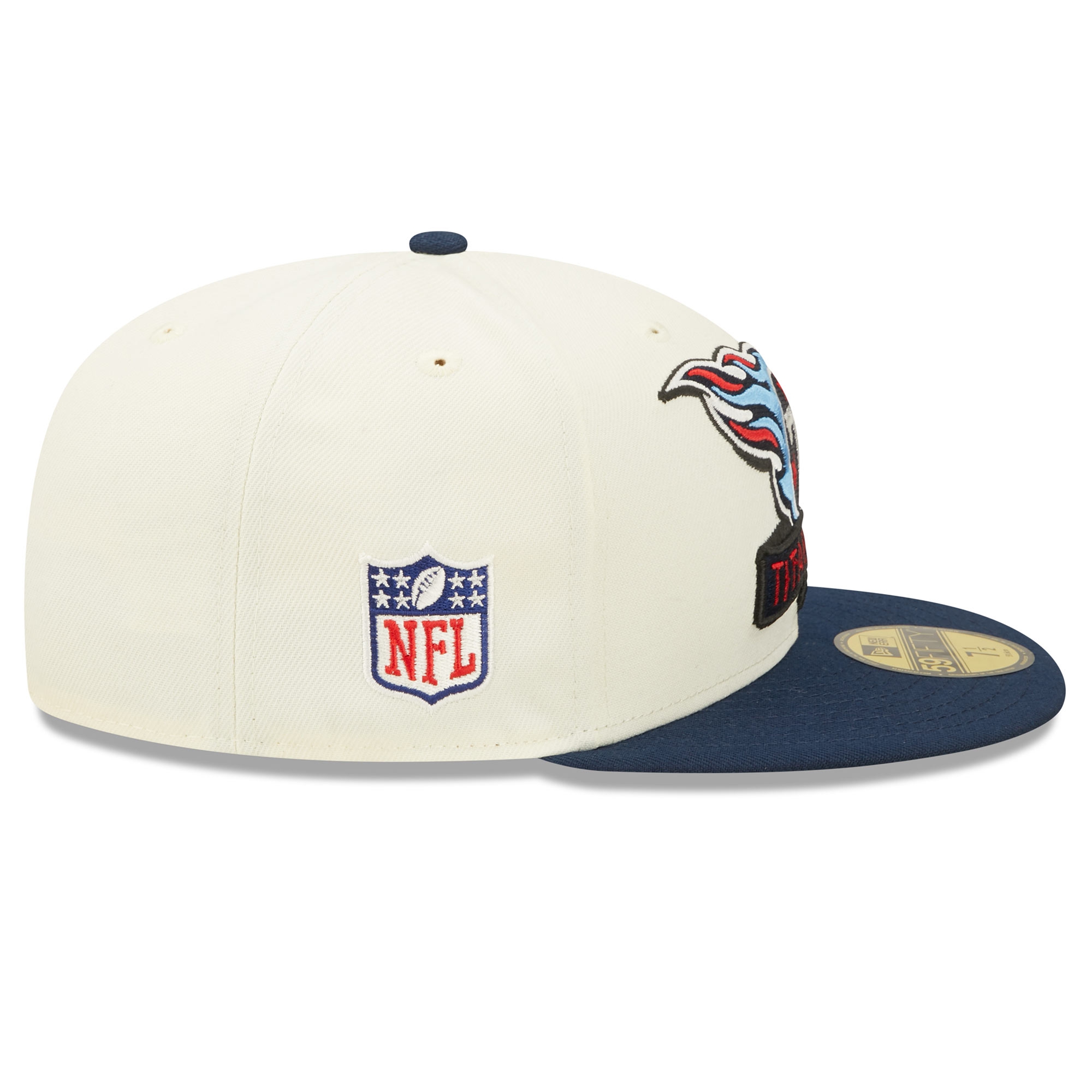 The brand new 2022 NFL Sideline New Era headwear collection comes in a traditional American football look. These two-tone caps feature a beige crown with a team colored visor. Front shows high-quality embroidered Tennessee Titans team logo with conference tag wording. Right panel features official NFL shield embroidery, while the closed back completes the look with an official team logo embroidery.