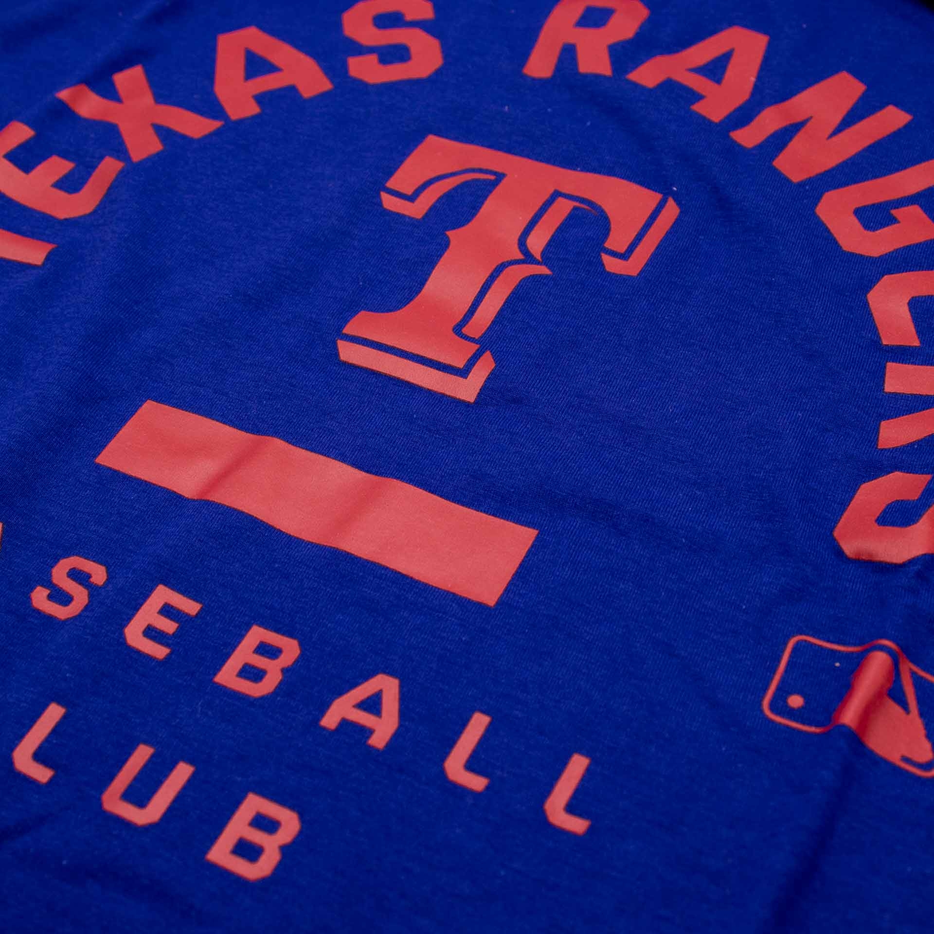 - Large Texas Rangers team graphic printed across the chest