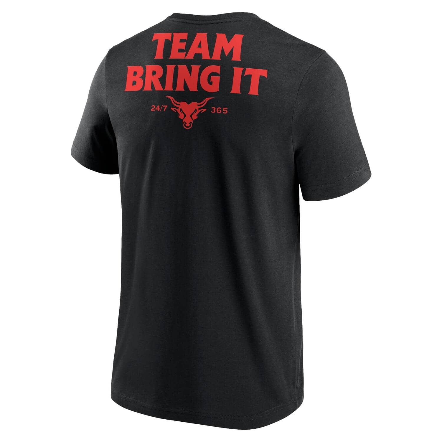 This officially licensed WWE T-shirt pays tribute to the legendary superstar Dwayne "The Rock" Johnson and his famous motto "Team Bring It." The shirt features the stylish "The Rock" logo on the front and the powerful "Team Bring It" lettering on the back, along with the iconic bull logo and the slogan "24/7 365." Perfect for fans who want to embody The Rock's unstoppable spirit and dedication.