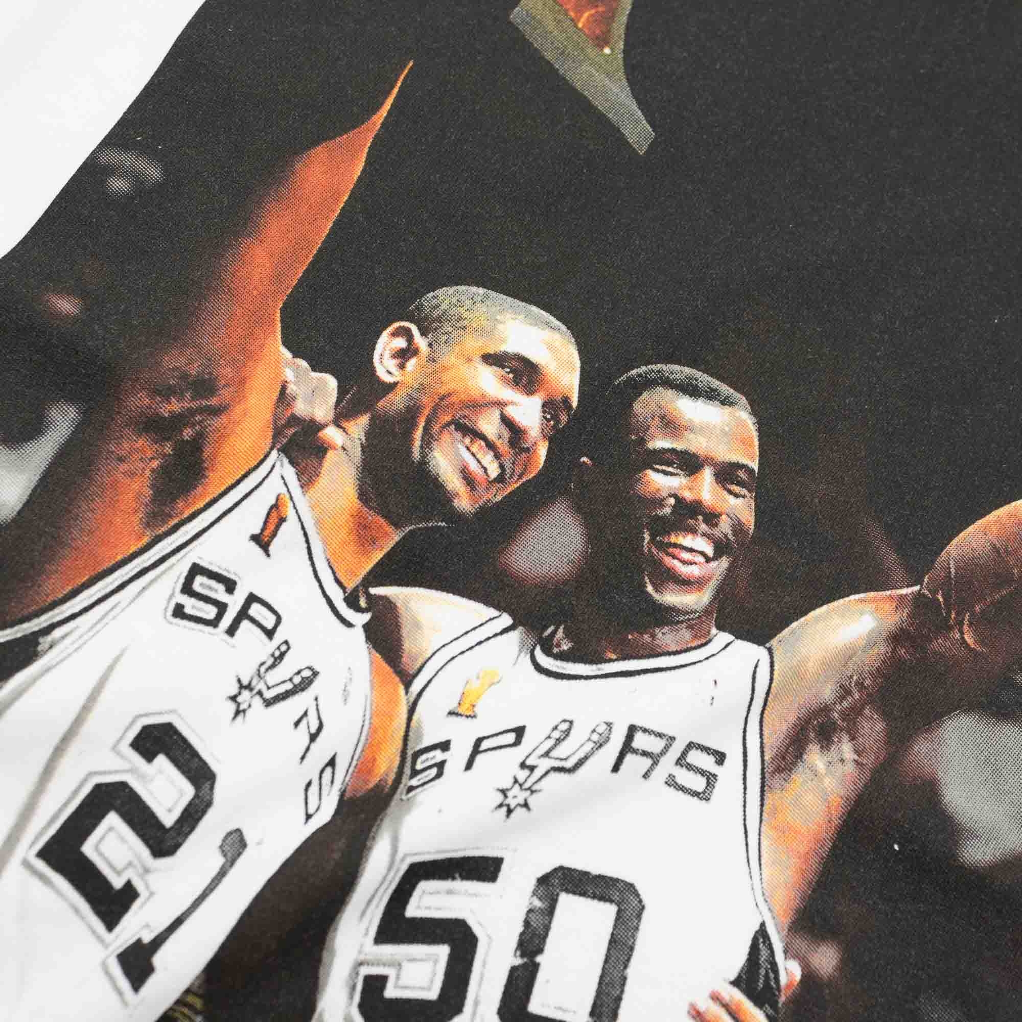 San Antonio Spurs Photo Player Print on front. The picture shows Tim Duncan and David Robinson. Mitchell & Ness printed jocktag at lower left hem.