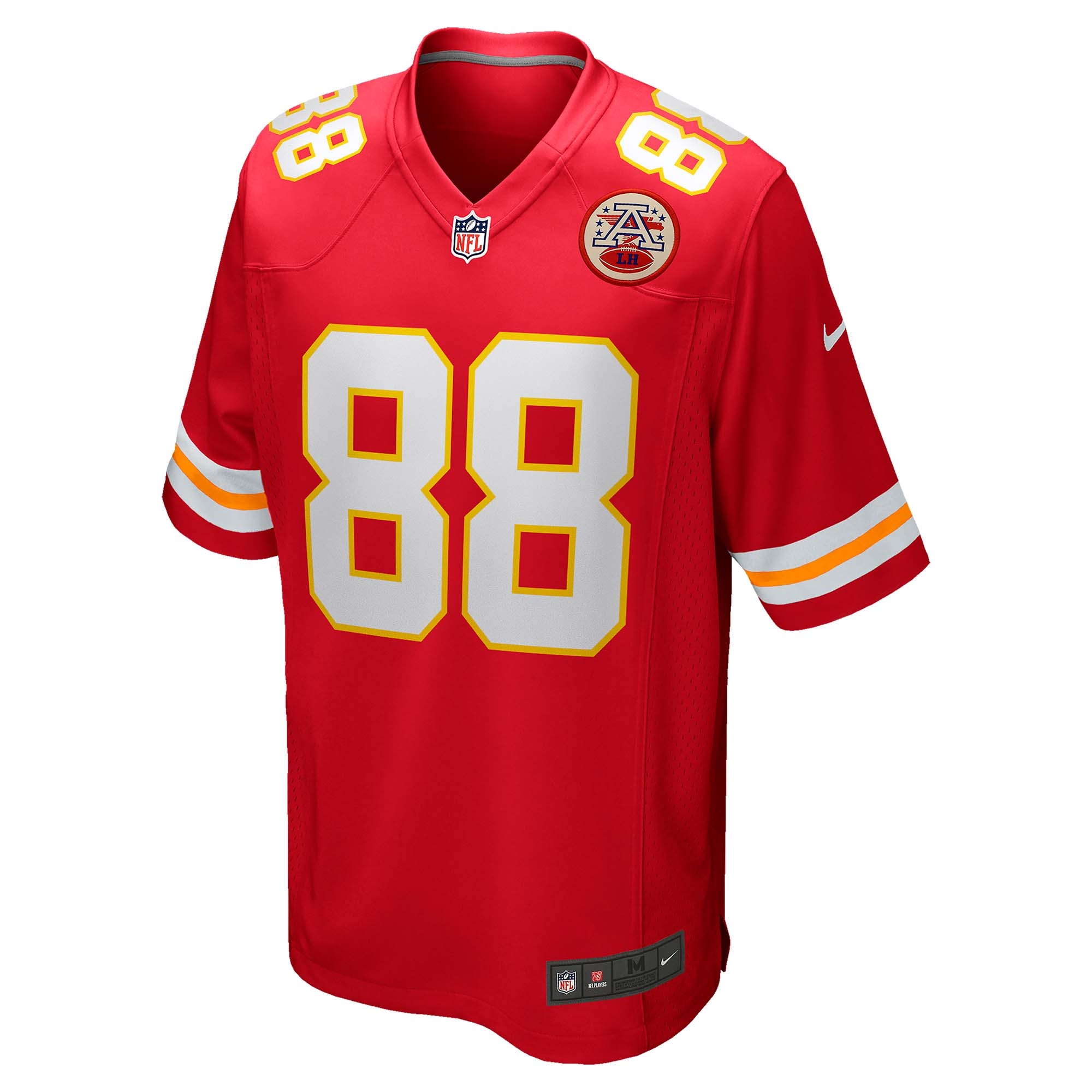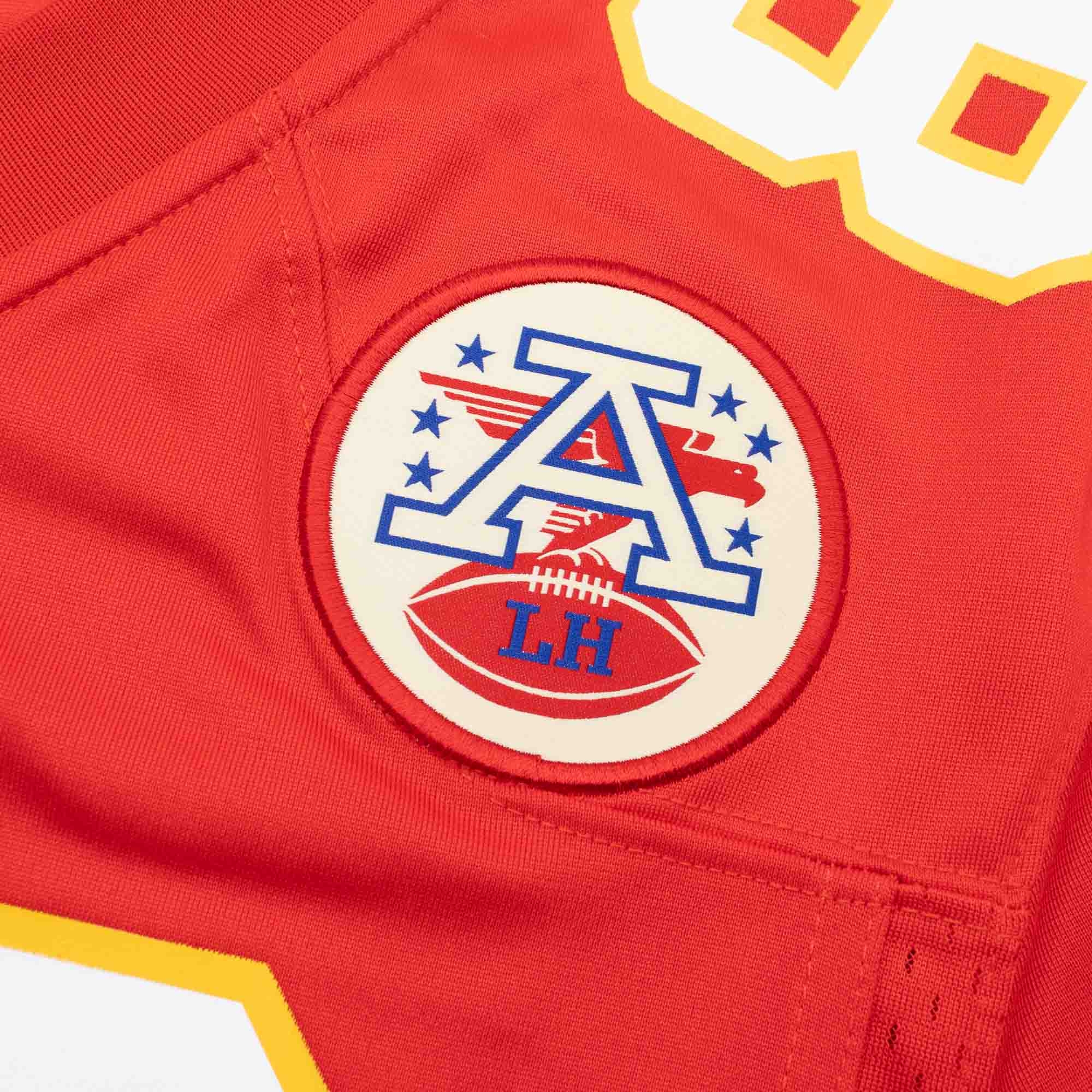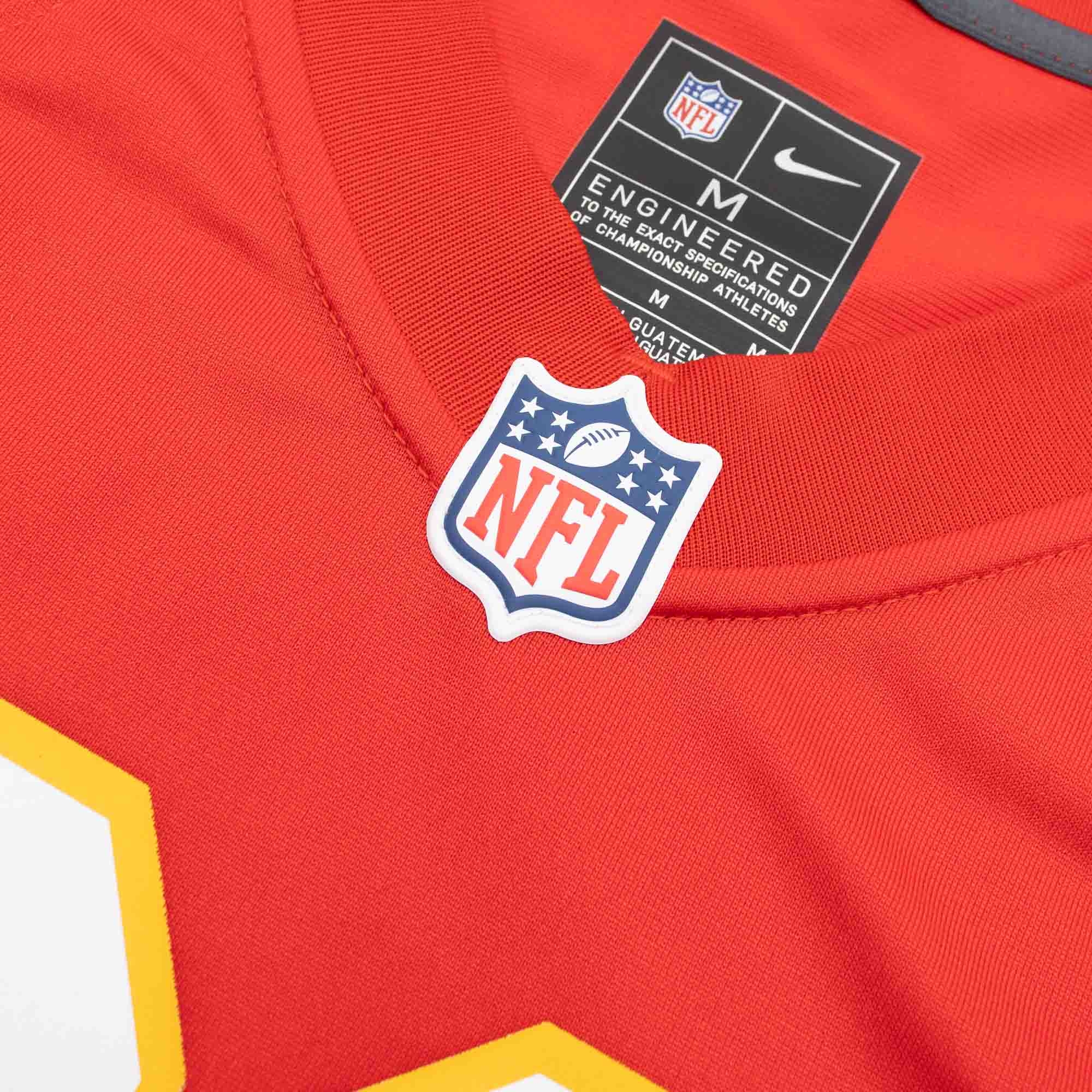 - Authentic Design: The jersey reflects the official design of the original NFL game jerseys, including the NFL shield at the collar and the equipment label at the hem. The iconic Kansas City Chiefs team stripes on the sleeves and the AFC patch on the chest perfectly complete the look.