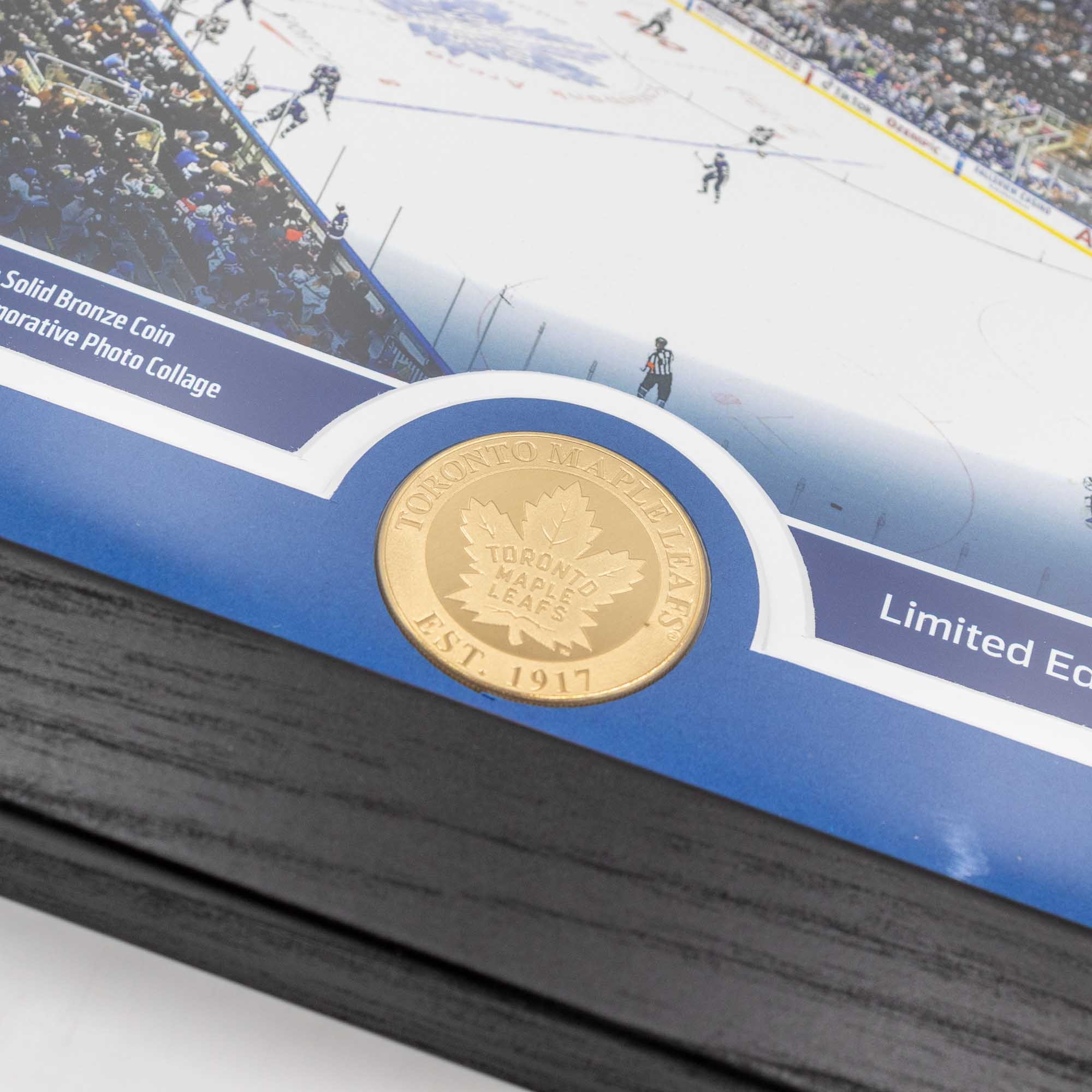 Highland Mint NHL Frame featuring the Toronto Maple Leafs with Stadium Background, Minted Bronze Coin and Stanley Cup Championships. Limited Edition of 5,000.