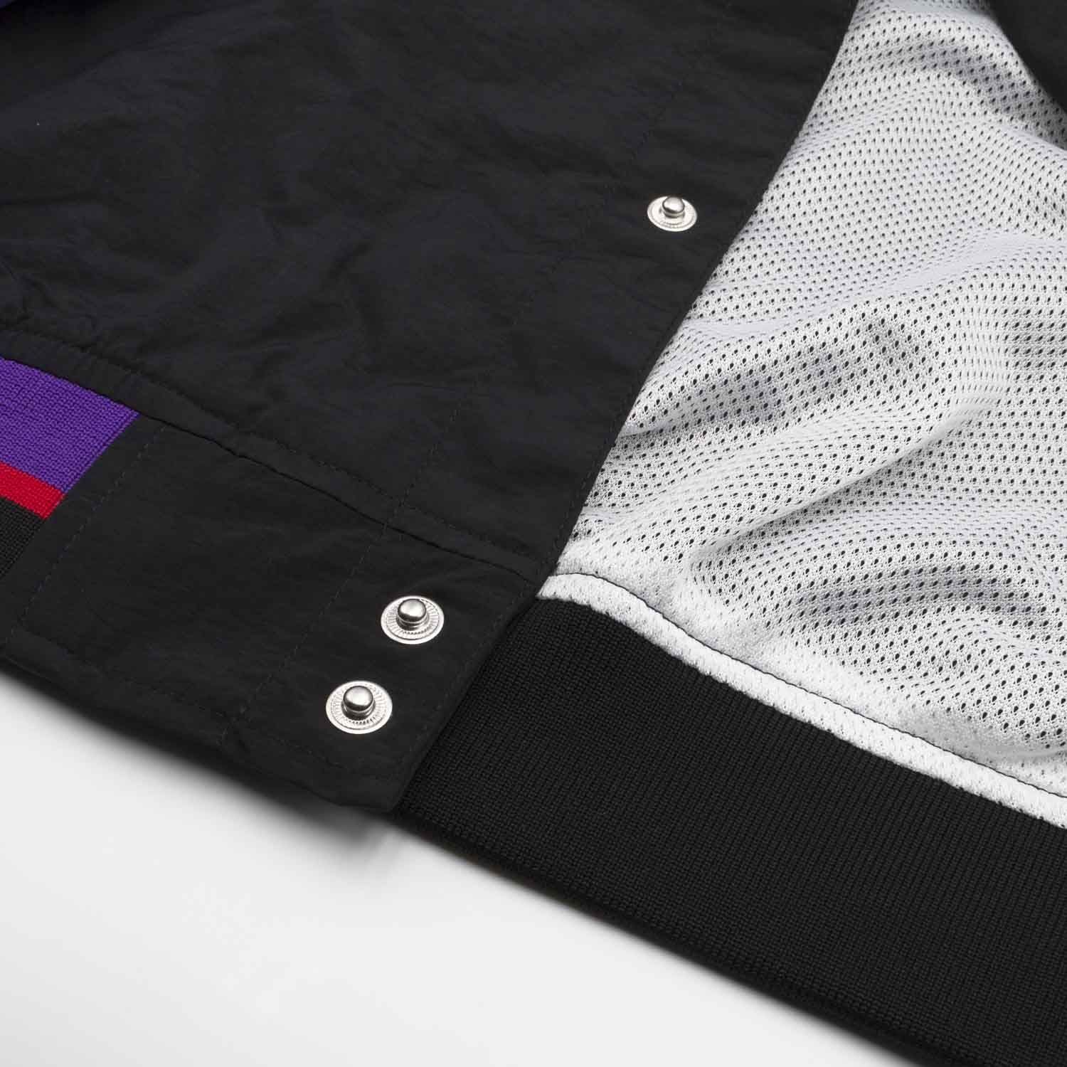 The nylon jacket features mesh lining to keep you cool and feeling fresh. An embroidered NBA league logo is found on the upper right chest, while the team name and year ID tag is sewn into the back waistband. Toronto Raptors retro team graphics cover front and back. Other features include 1×1 rib trim on the collar, sleeves and waistband, side pockets, as well as a center snap closure. Mitchell & Ness lettering embroided on right cuff. This jacket is tailored fit, meaning it fits slimmer in the body.