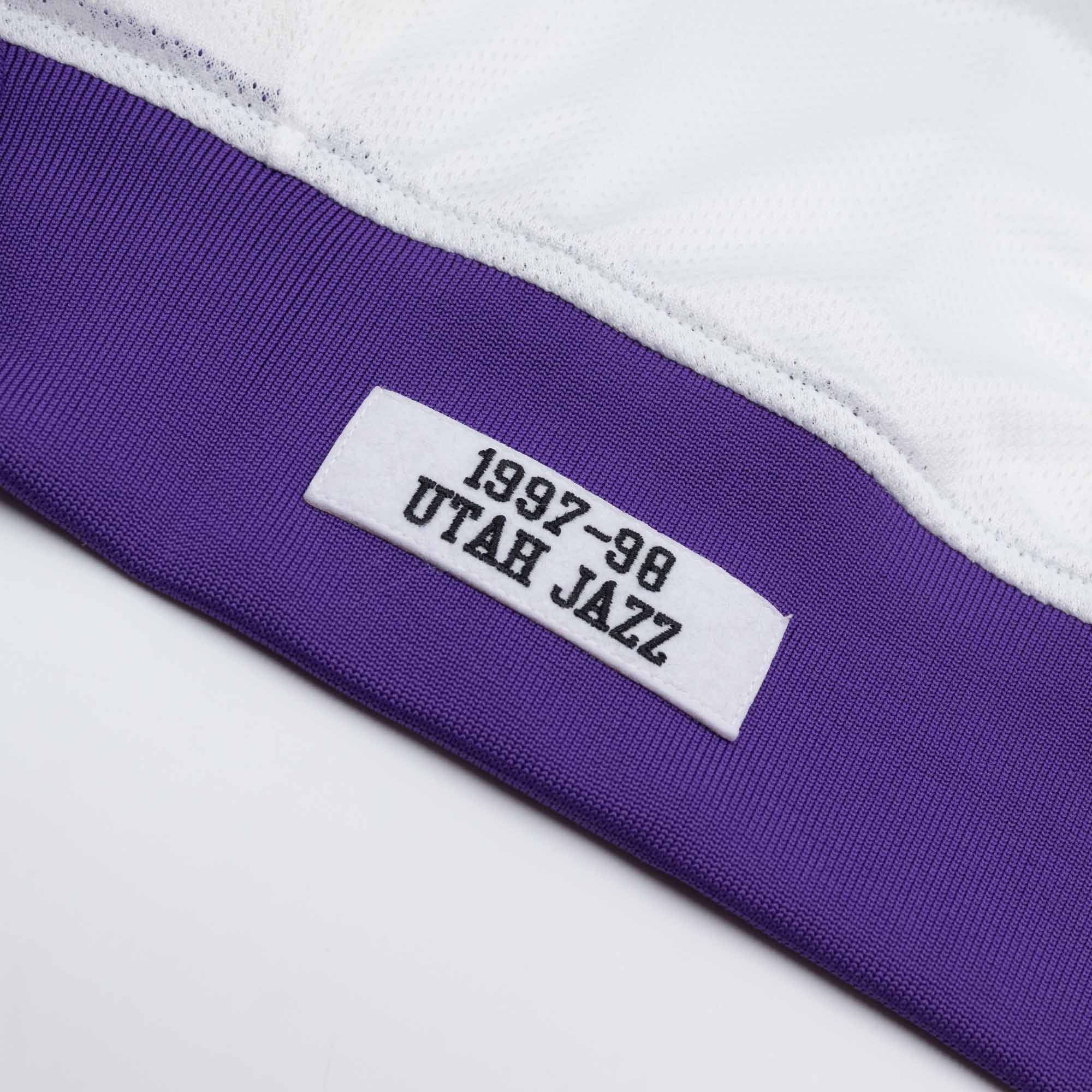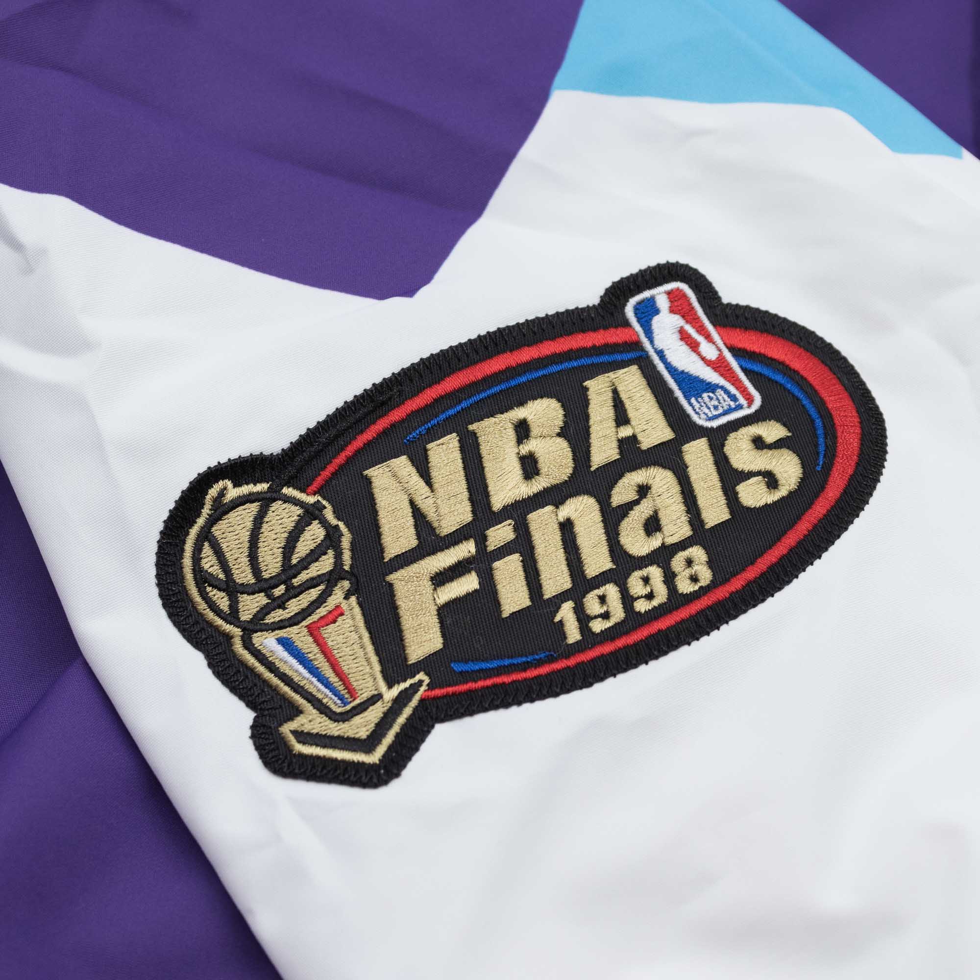 The basketball jacket features mesh lining to keep you cool and feeling fresh. An embroidered NBA league logo is found on the upper right chest, while the team name and year ID tag is sewn into the back waistband. Utah Jazz retro team graphics cover front and back. 1998 NBA Finals patch on right sleeve. Other features include 1×1 rib trim on the collar, sleeves and waistband, side pockets, as well as a center snap closure. Mitchell & Ness lettering embroidered on right cuff. This jacket is tailored fit, meaning it fits slimmer in the body.