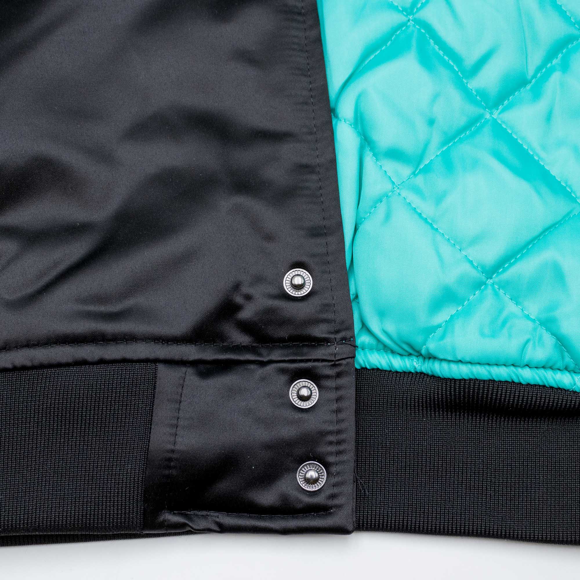 This heavyweight NBA satin jacket features Vancouver Grizzlies special script and classic team logo embroidery on front. Mitchell & Ness logo embroidered on right sleeve cuff. Contrast color self-fabric taping on sleeves and body. Fully lined in quilted polyester taffeta. Rib-knit collar, cuffs & waistband. Two front pockets, inside pocket and full front snap closure.