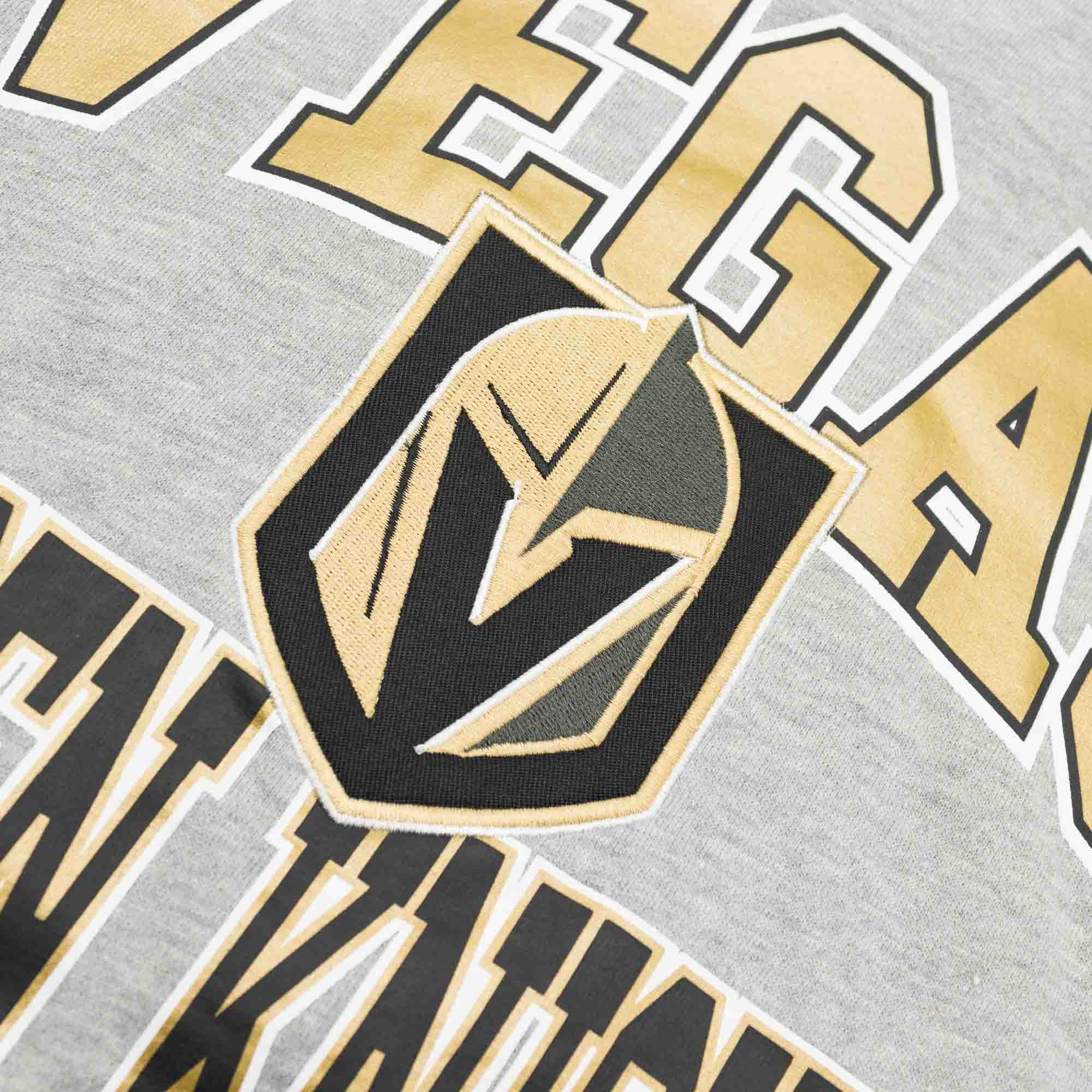 The hooded sweater is embroidered with a Vegas Golden Knights team logo on front combined with a large VEGAS GOLDEN KNIGHTS lettering print. The official confernce logo adorns the right sleeve as a high-quality embroidery piece.