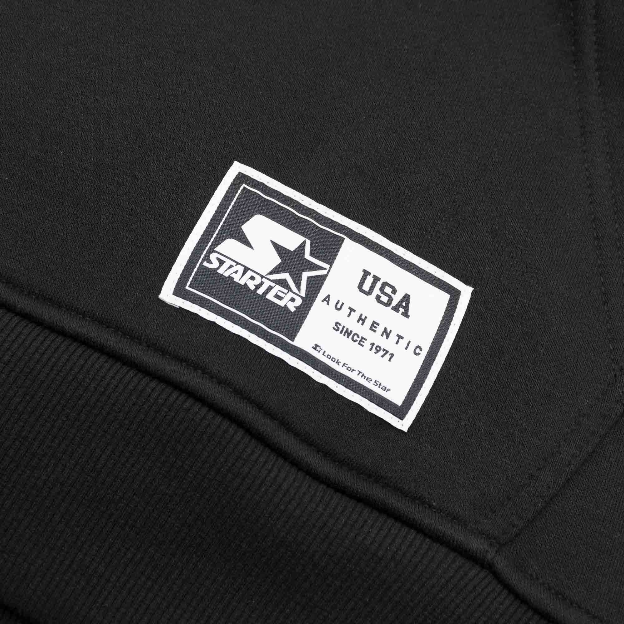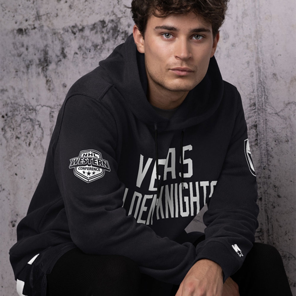 The Starter Premium Fleece Hoodie is of absolutely high quality and comes in an all-black design. The hood and front pocket, combined with the soft cotton-polyester fleece, ensure a comfortable fit. The large VEGAS GOLDEN KNIGHTS lettering is embroidered on the front in a high-quality chain-stitch style. The team logo is sewn onto the left sleeve and the conference logo is adorned on the right sleeve. The legendary Starter look is rounded off with the embroidered star logo on the sleeve hem and the sewn-on Starter Authentic label on the front hem.
