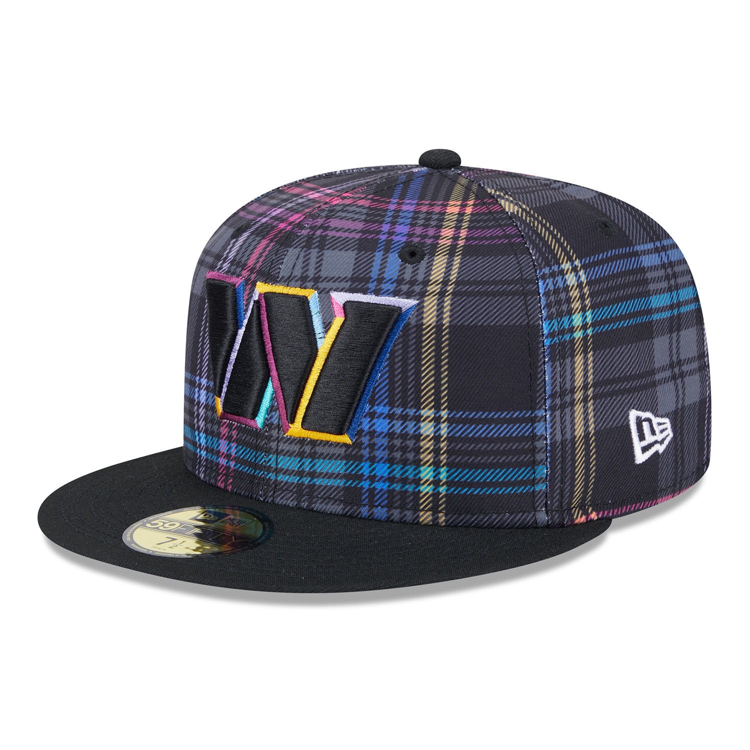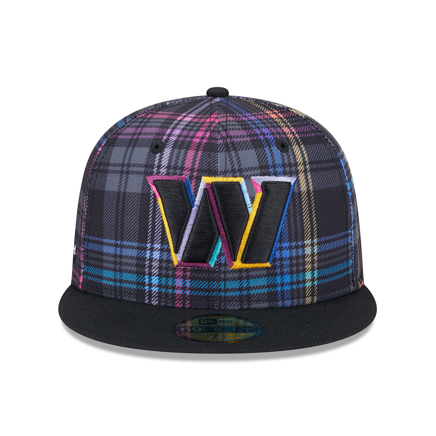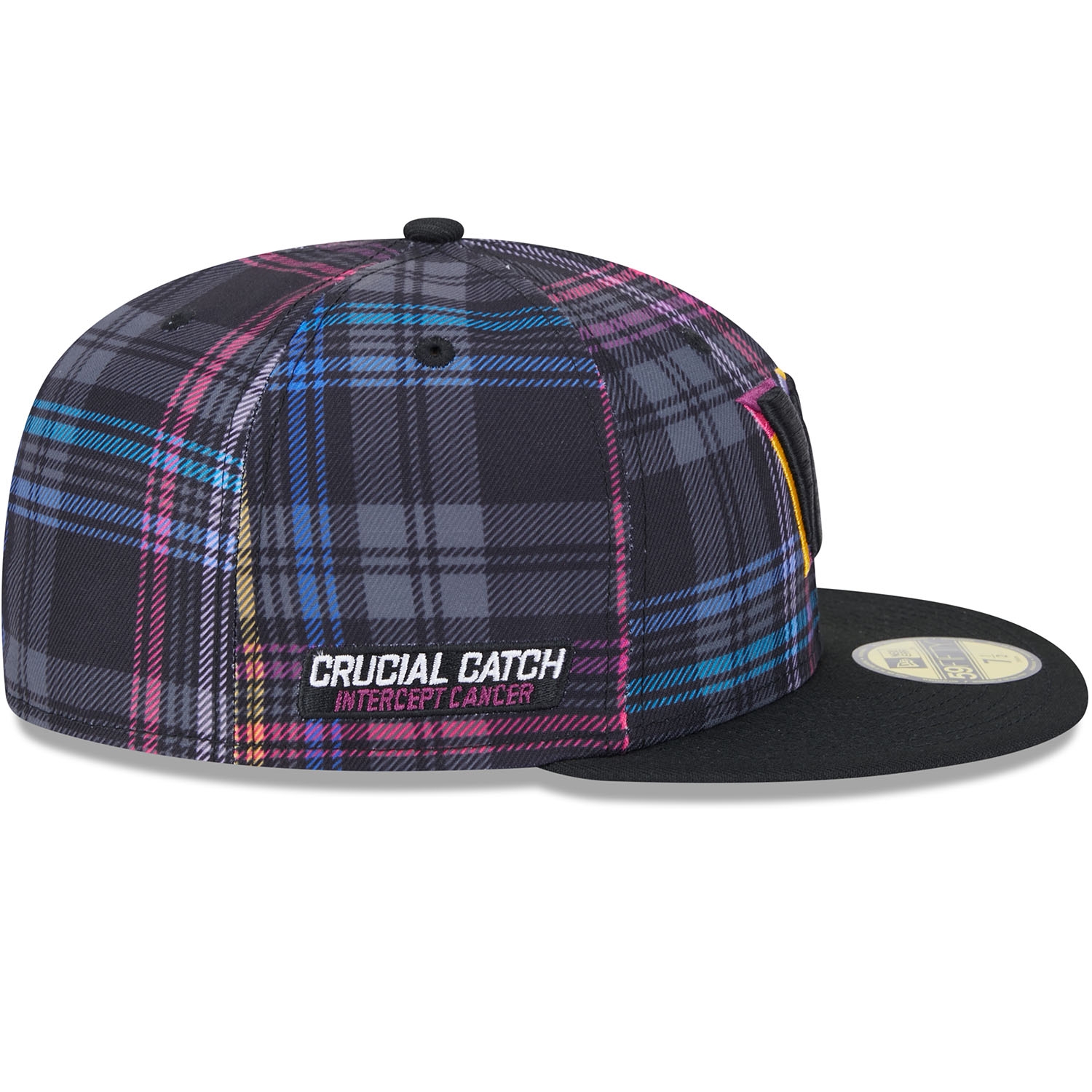 Support the global fight against cancer with the official New Era 2024 NFL Crucial Catch On-Field Cap. This closed fitted NFL cap is worn on the sidelines during the 2024-25 Crucial Catch campaign in October. The front of the cap is embroidered with the brightly accented Washington Commanders team logo. The right side features the "CRUCIAL CATCH - INTERCEPT CANCER" patch, while the back is adorned with the embroidered NFL logo. The sublimated plaid design on all six panels in the signature Crucial Catch colors gives it a unique look.