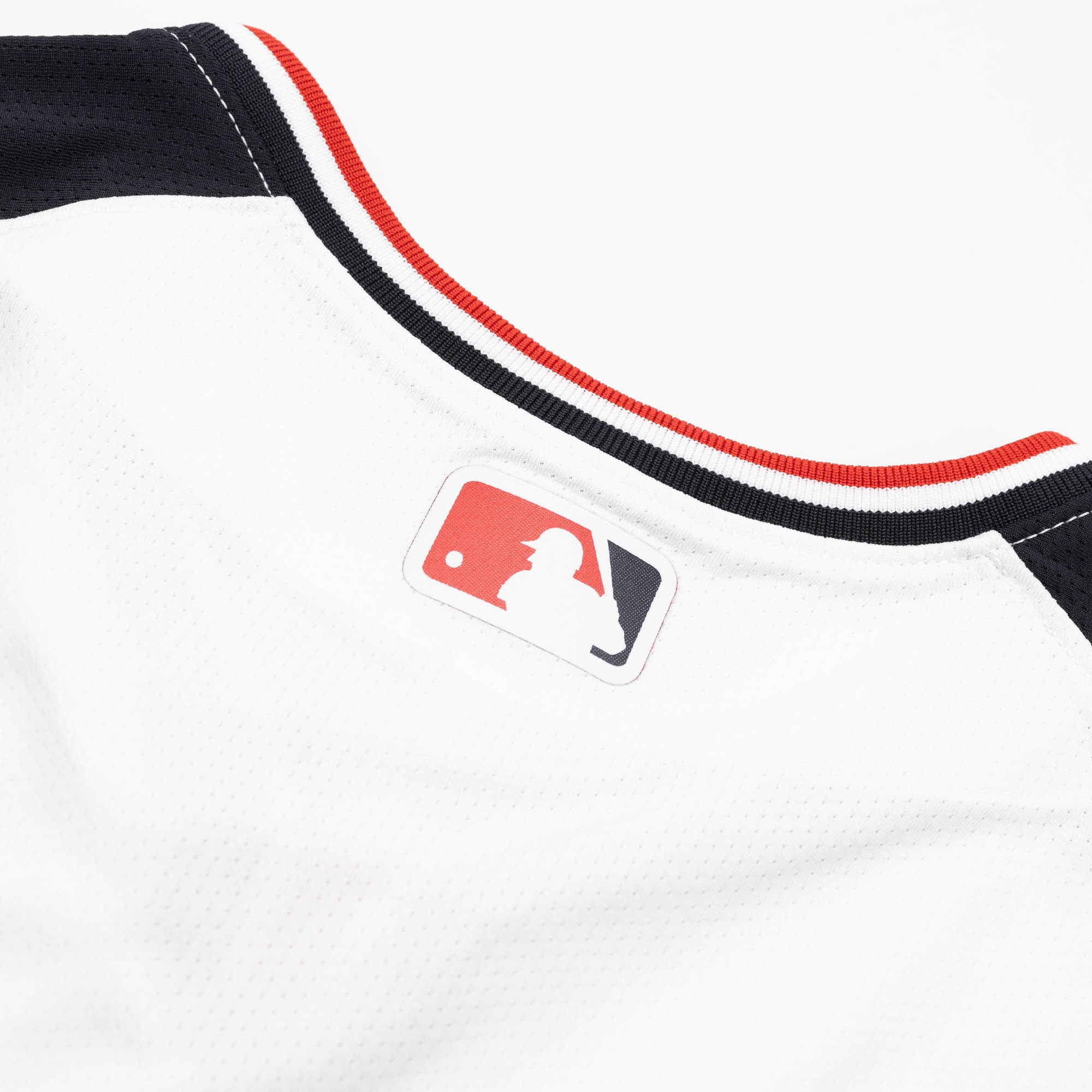 Inspired by the on-field uniforms of your favorite MLB squad, this Washington Nationals Jersey delivers an authentic look with twill details. The sweat-wicking, double-knit mesh fabric helps provide a breathable, comfortable feel on game day. Official heat-sealed twill Washington Nationals wordmark logo with zigzag stitching on front. Embroidered Nike Swoosh logo. Sublimated team logo sleeve patch. Heat-applied woven MLB Batterman on back and Nike jock tag at front hem.