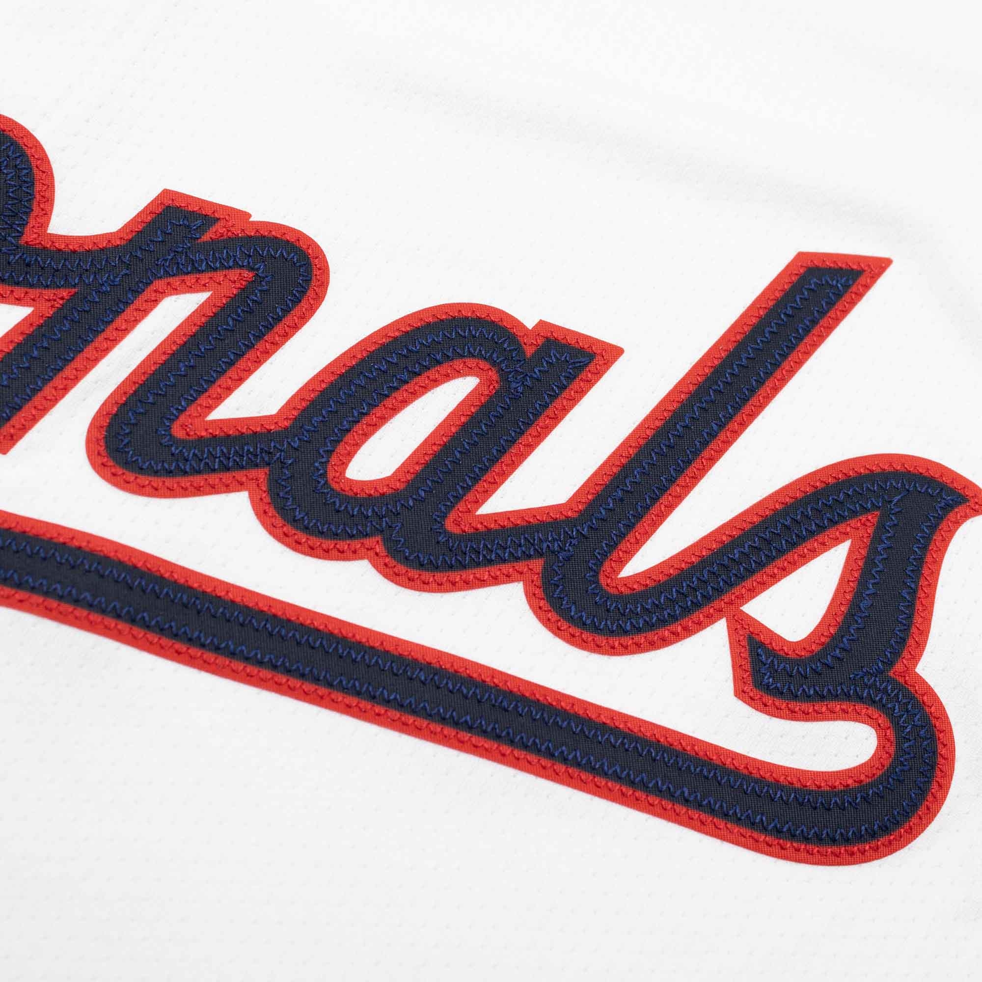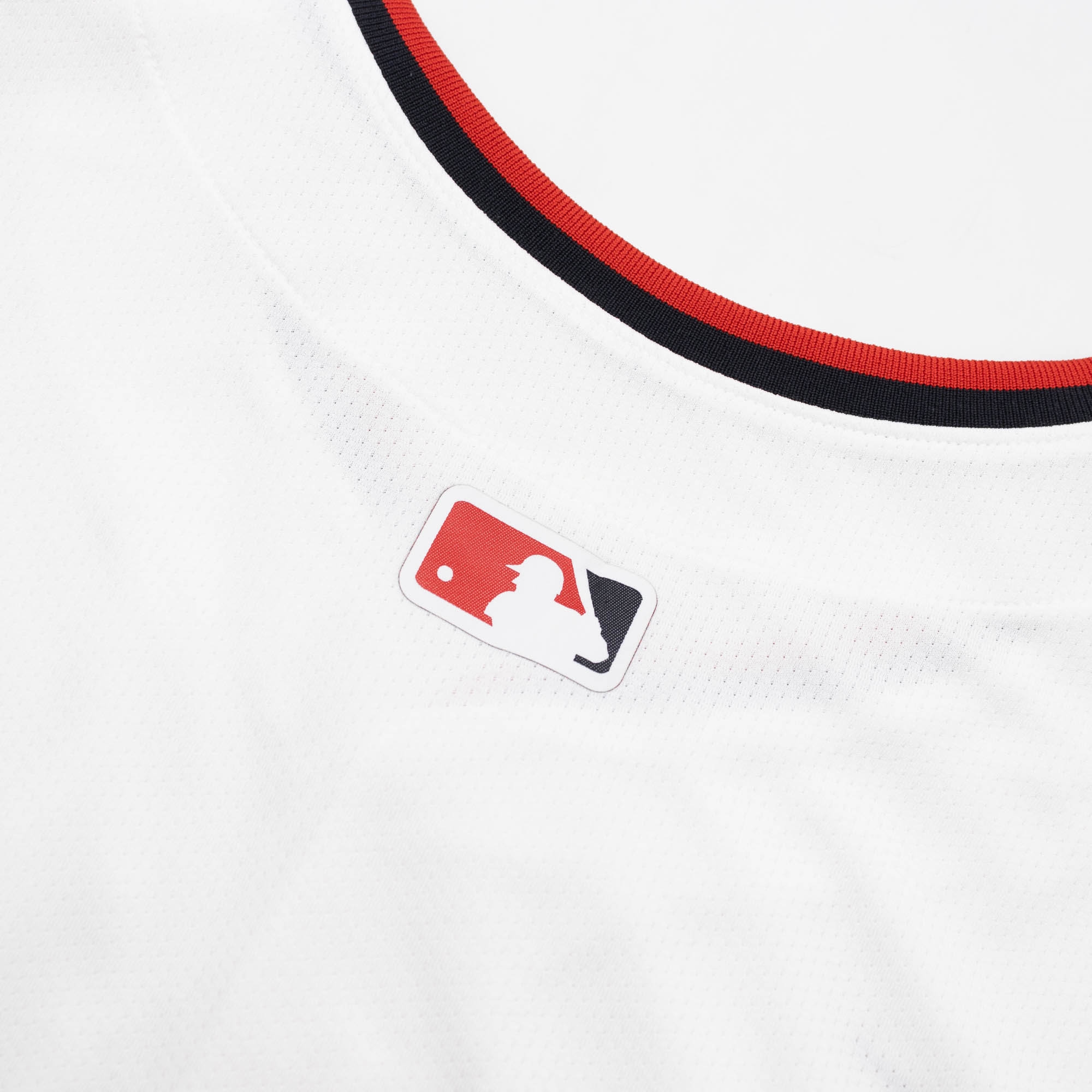 Inspired by the on-field uniforms of your favorite MLB squad, this Washington Nationals Jersey delivers an authentic look with twill details. The sweat-wicking, double-knit mesh fabric helps provide a breathable, comfortable feel on game day. Official heat-sealed twill Washington Nationals wordmark logo with zigzag stitching on front. Embroidered Nike Swoosh logo. Sublimated team logo sleeve patch. Heat-applied woven MLB Batterman on back and Nike jock tag at front hem.