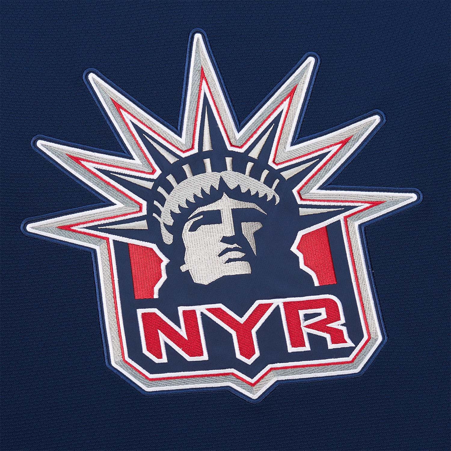 - Embroidered Lady Liberty crest on the chest and authentic Rangers shoulder patches.