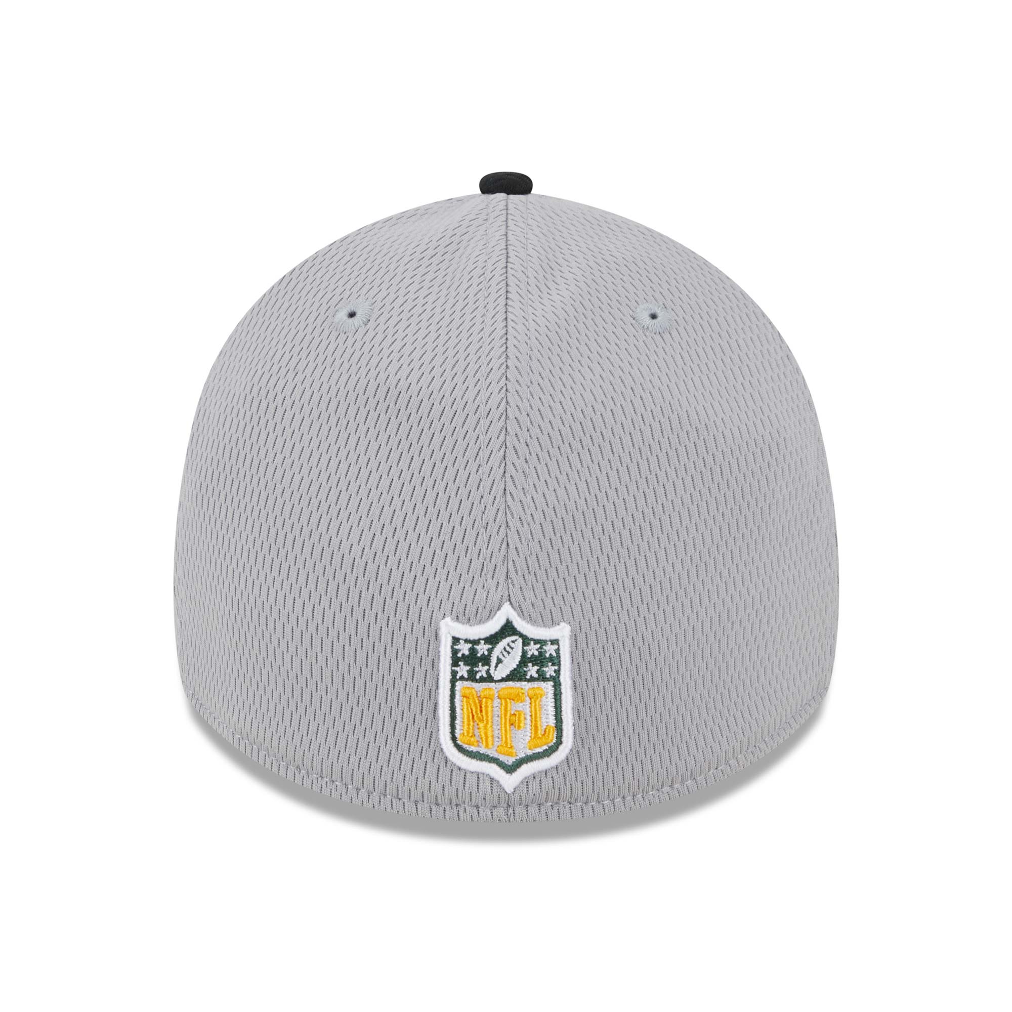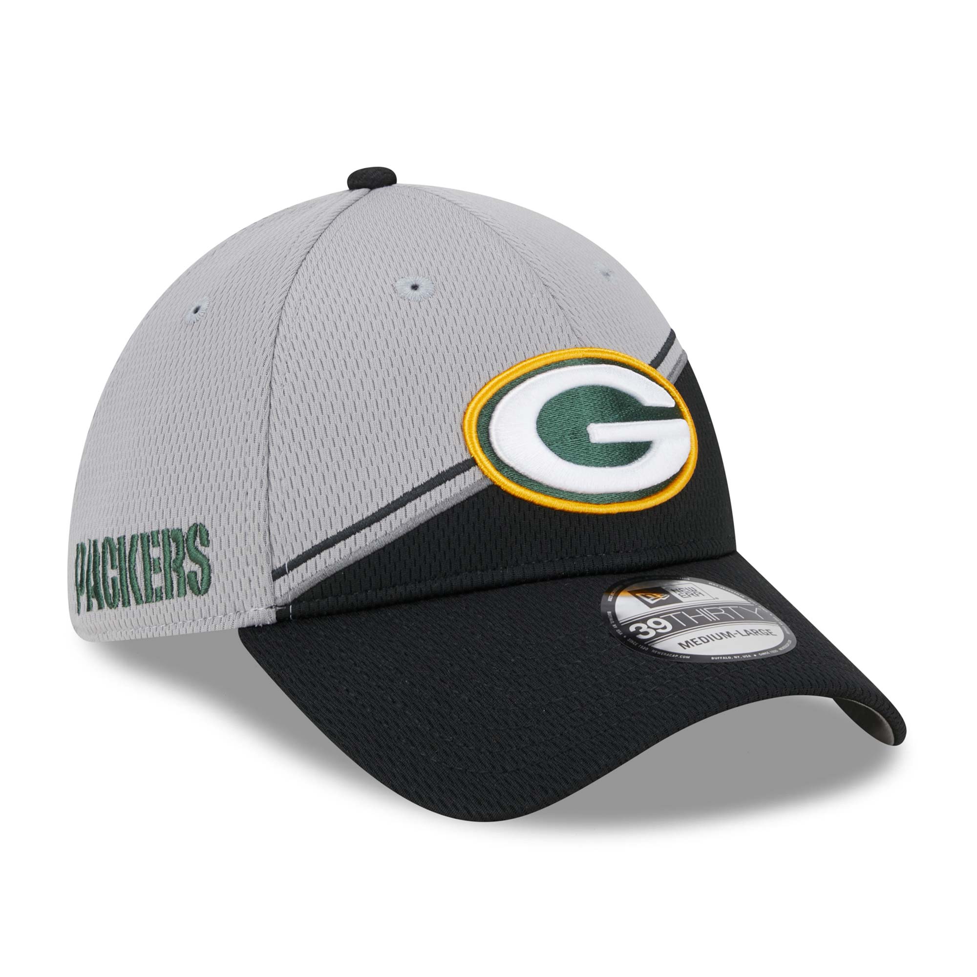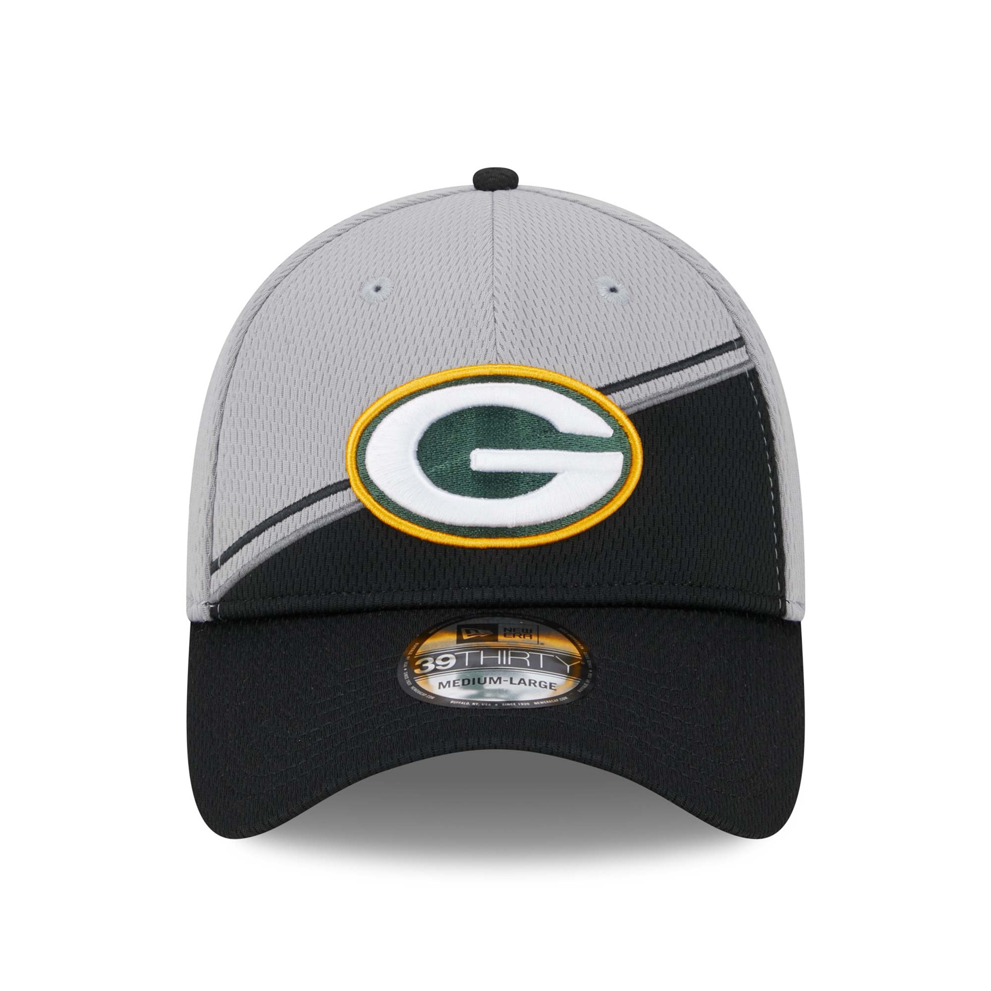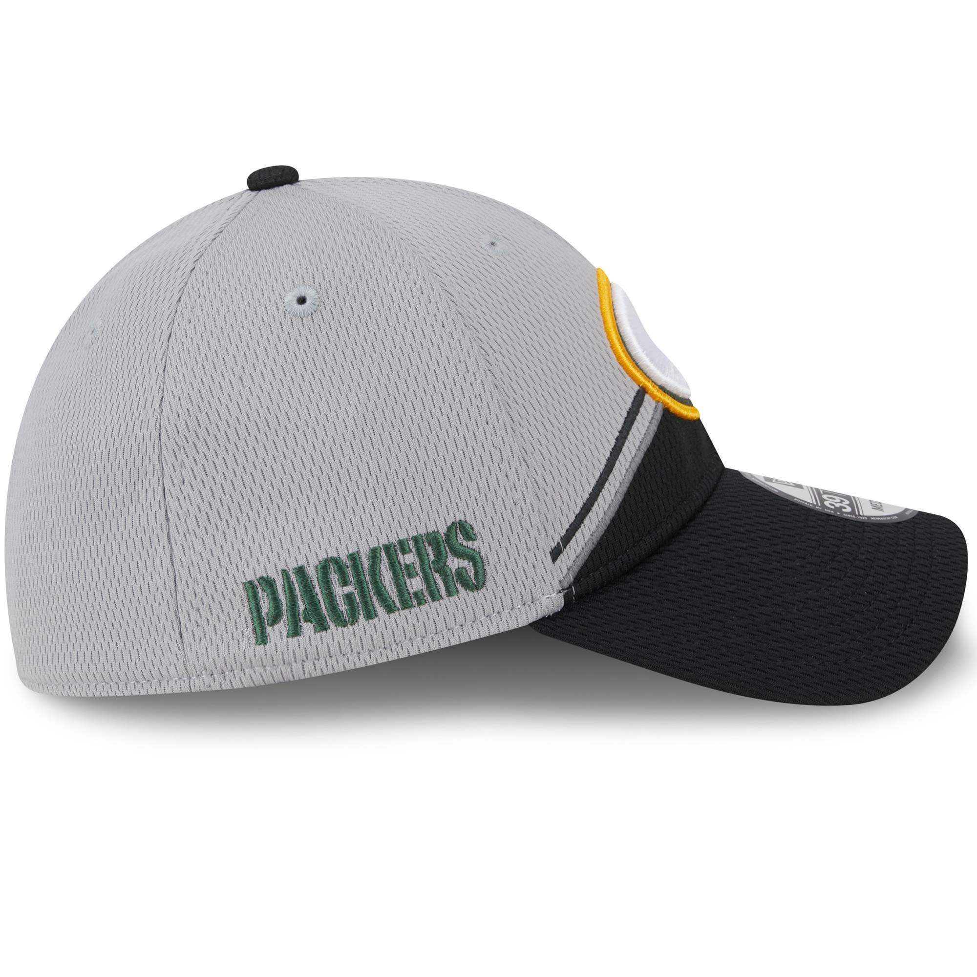 New Era American Football Flex Cap von deinen Green Bay Packers im Stretch-Fit 39THIRTY Style aus der schwarz-grauen Colorway 2023 NFL On Field Sideline Kollektion.