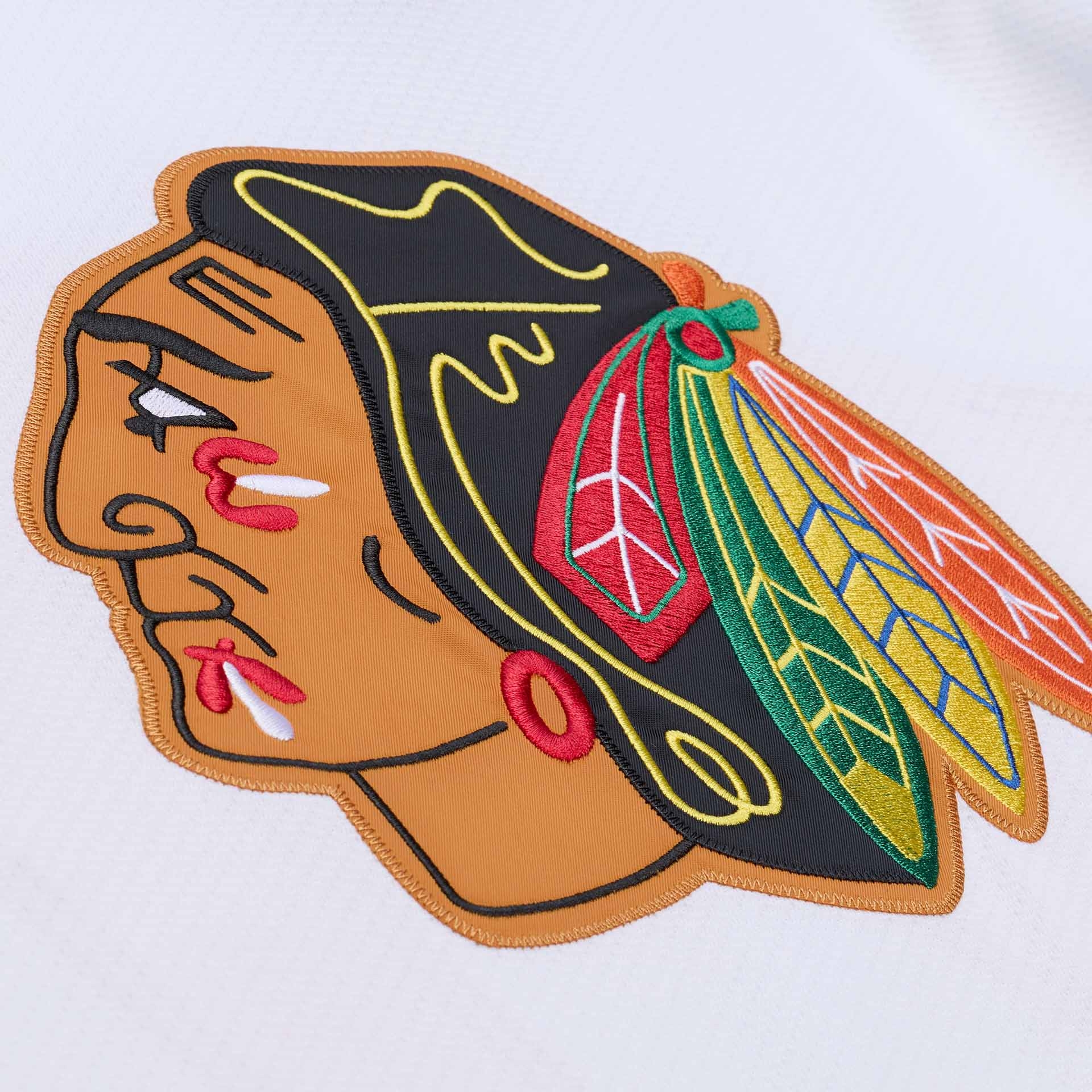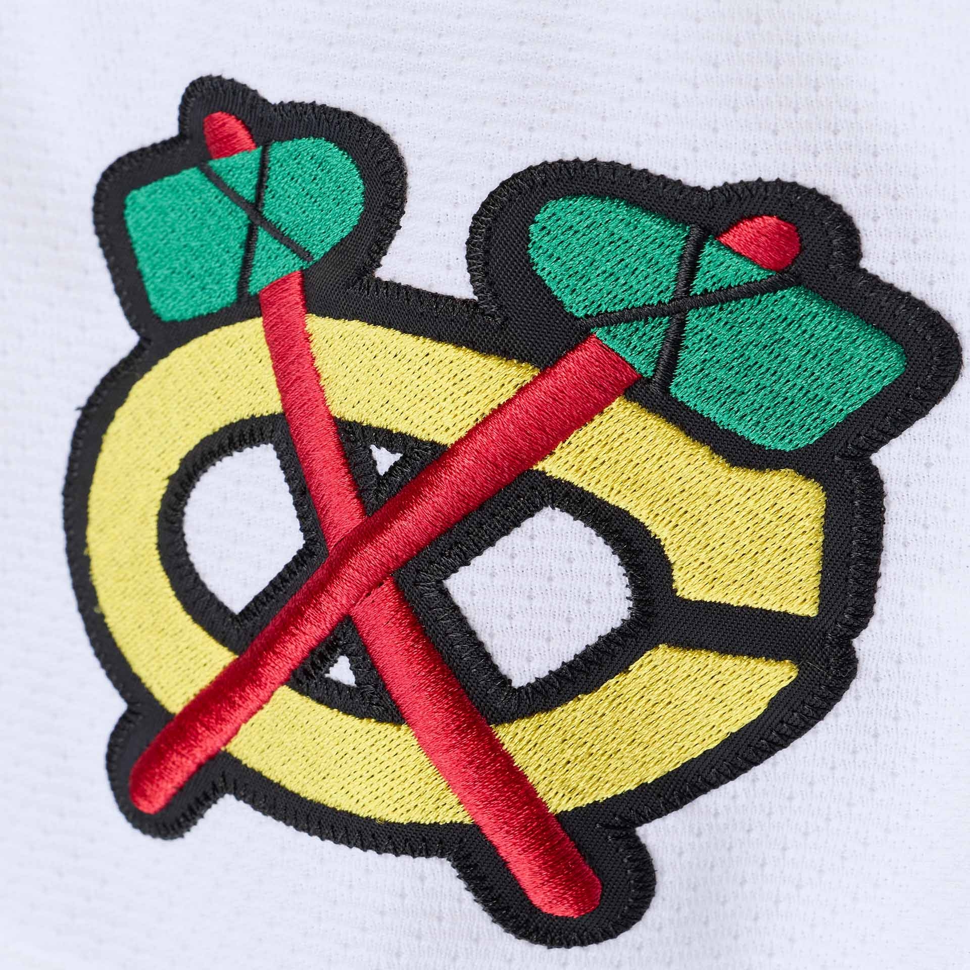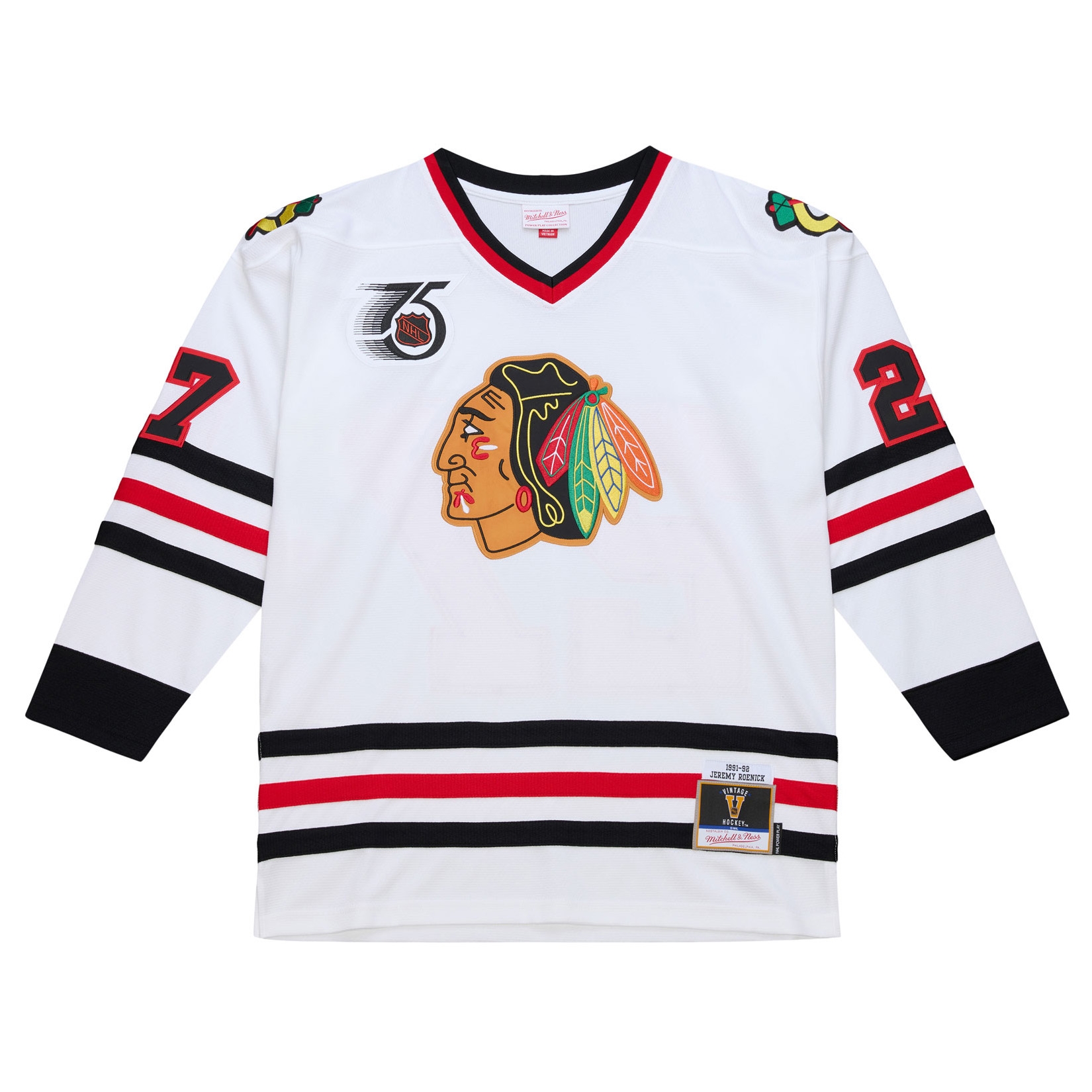 - Vintage Blackhawks Design: Offizielles 1991-92 Chicago Blackhawks Design in Weiß mit markanten rot-schwarzen Streifen und voll gesticktem Indian-Head-Teamlogo auf der Brust.