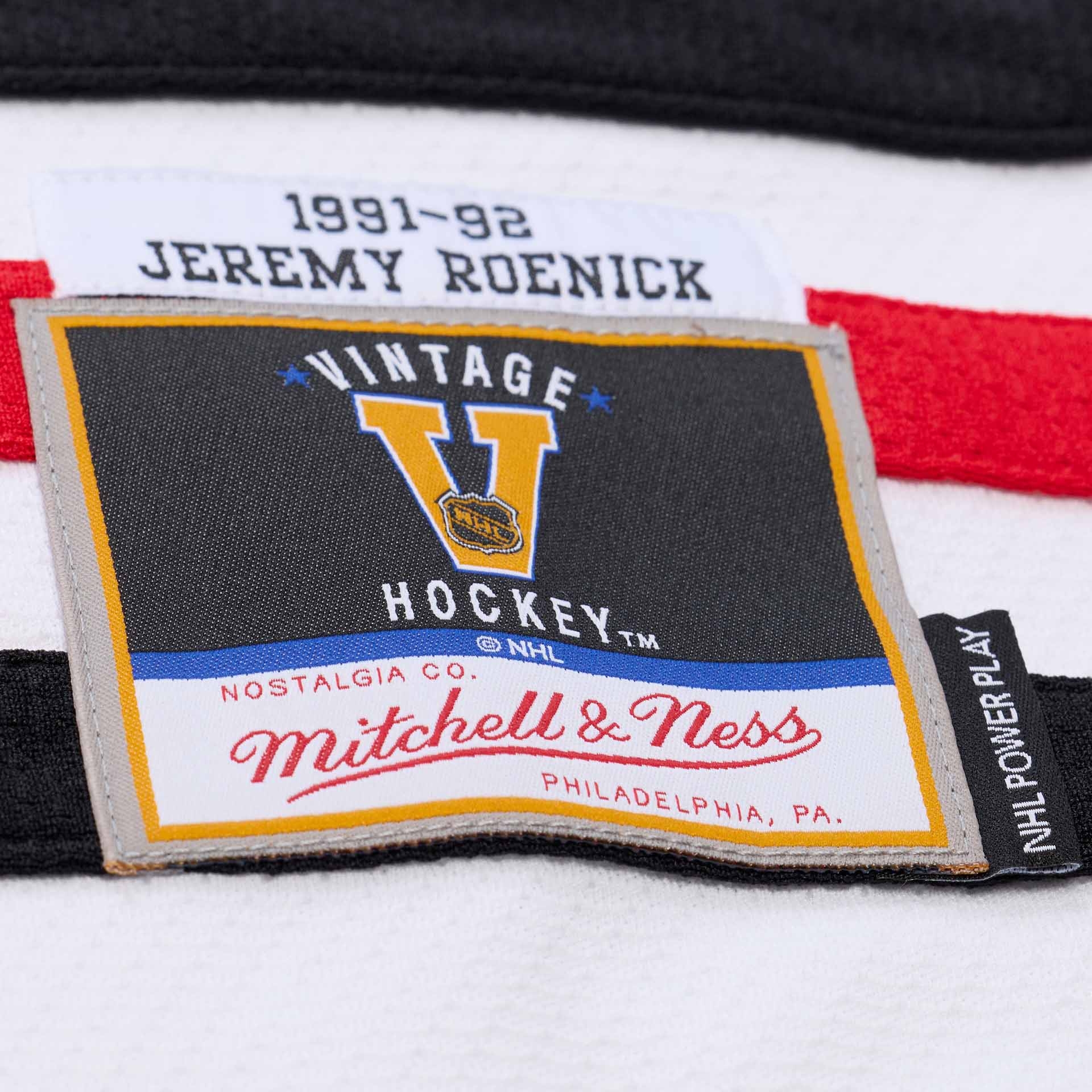 Mitchell & Ness NHL Herren Power Play Eishockey Trikot von Chicago Blackhawks Legende Jeremy Roenick aus der Saison 1991-92.