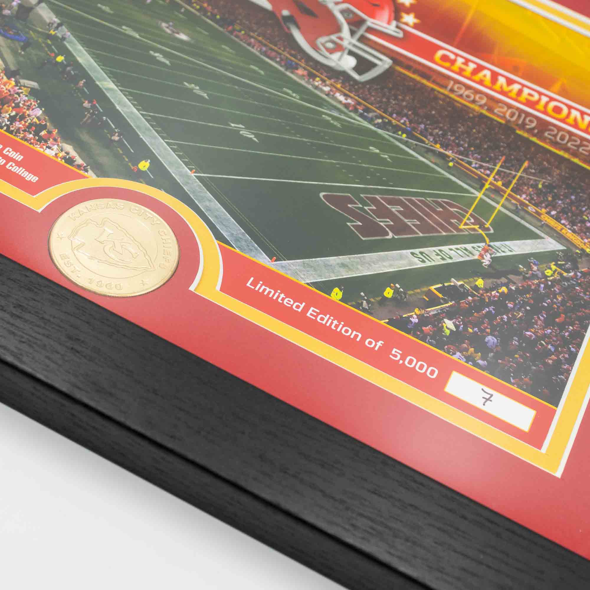 Highland Mint NFL gerahmtes Bild von deinen Kansas City Chiefs mit Stadionhintergrund und geprägter Bronzemünze. Limitierte Auflage zu 5.000 Stück.