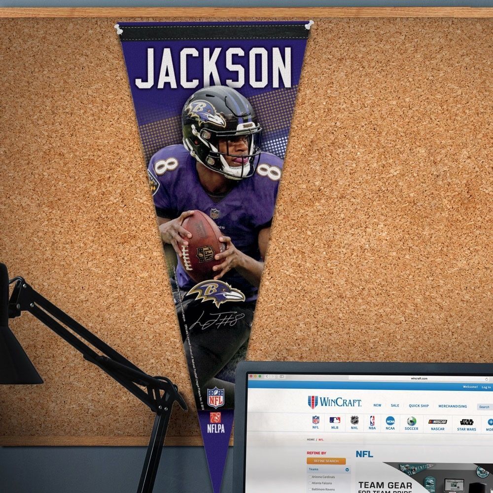 WinCraft NFL Premium American Football Wimpel von Lamar Jackson, Quarterback der Baltimore Ravens.