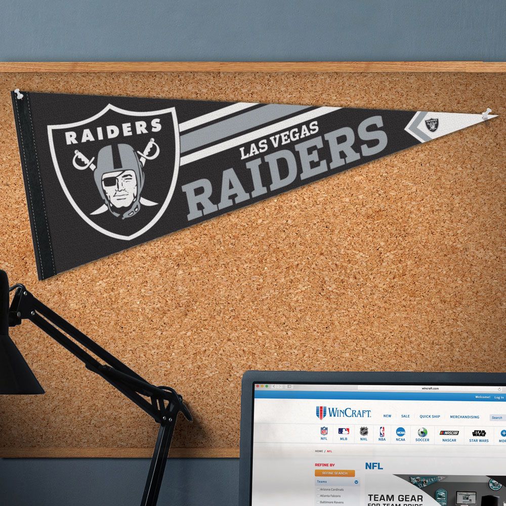 Hochwertiger American Football Wimpel von WinCraft im Las Vegas Raiders Big Logo Design. Der Wimpel besteht aus einem robusten Filzstoff und kann dadurch problemlos aufgerollt und transportiert werden. Sport-Wimpel sind eine typisch amerikanische Form der Raumdekoration und können einfach wie ein Poster an eine Wand gehängt werden.