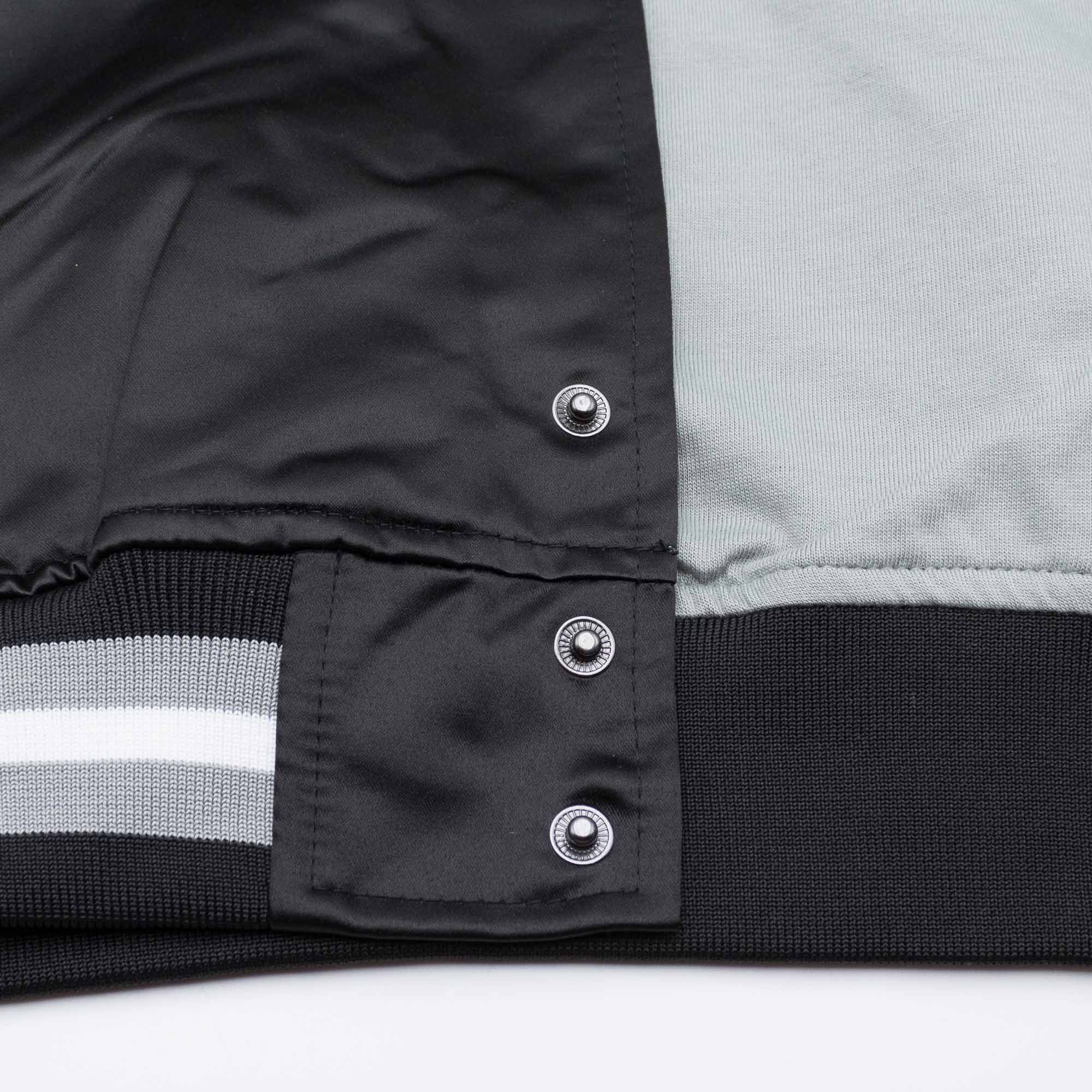 Premium Mitchell and Ness Las Vegas Raiders Retro Jacke mit klassischer Satin-Außenhülle aus der NFL Throwbacks Kollektion. Die NFL Jacke hat zwei äußere Taschen, eine Innentasche und eine durchgehende Knopfleiste. Das Design ist den amerikanischen College und High School Jacken nachempfunden und der Mitchell & Ness Schriftzug ist wie immer am rechten Ärmelsaum aufgestickt. Auf der Front ist der klassische RAIDERS Schriftzug hochwertig aufgenäht. Unter dem Kragen auf der Innenseite sind außerdem das NFL Throwbacks und das Mitchell & Ness Logo aufgenäht. Das weiche Jersey-Inlay sorgt für ein absolut angenehmes Tragegefühl. Mit dem eindeutigen NFL Style ist diese leichte Jacke ein perfekter Begleiter für die Übergangszeit im Herbst, Frühling oder in kühlen Sommernächten.