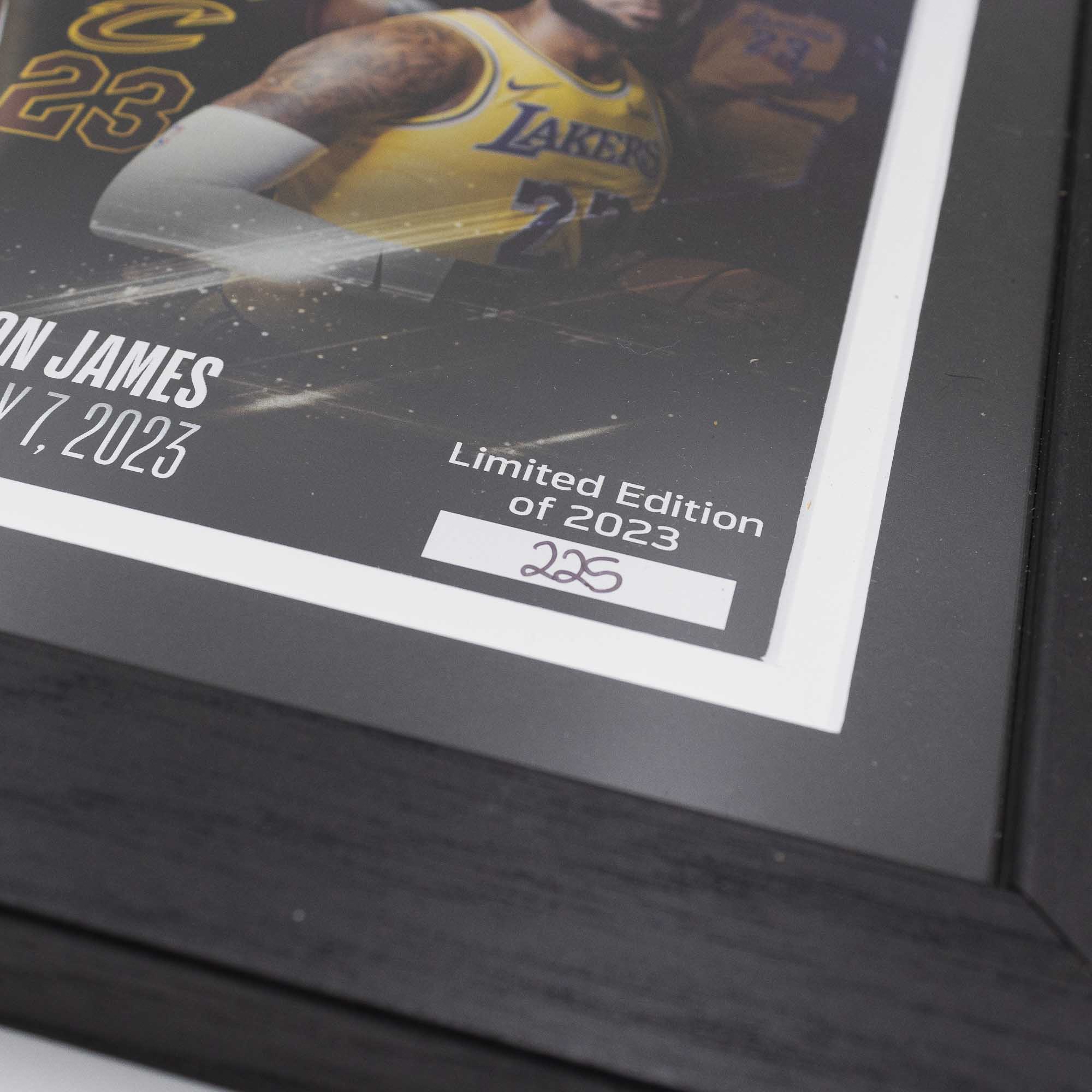 Dieses 30 cm x 50 cm Kunstwerk mit doppelter Mattierung und einer Glasfrontplatte zeigt ein individuell nummeriertes Foto vom NBA All-Time Leading Scorer LeBron James. Das Bild zeigt "King James" in den Trikots seiner verschiedenen Teams: Cavaliers, Heat und Lakers. Zusätzlich wird dieses einmalige Sammlerstück mit einer geprägten 39 mm LeBron James NBA Scoring Record Bronze-Gedenkmünze hervorgehoben.