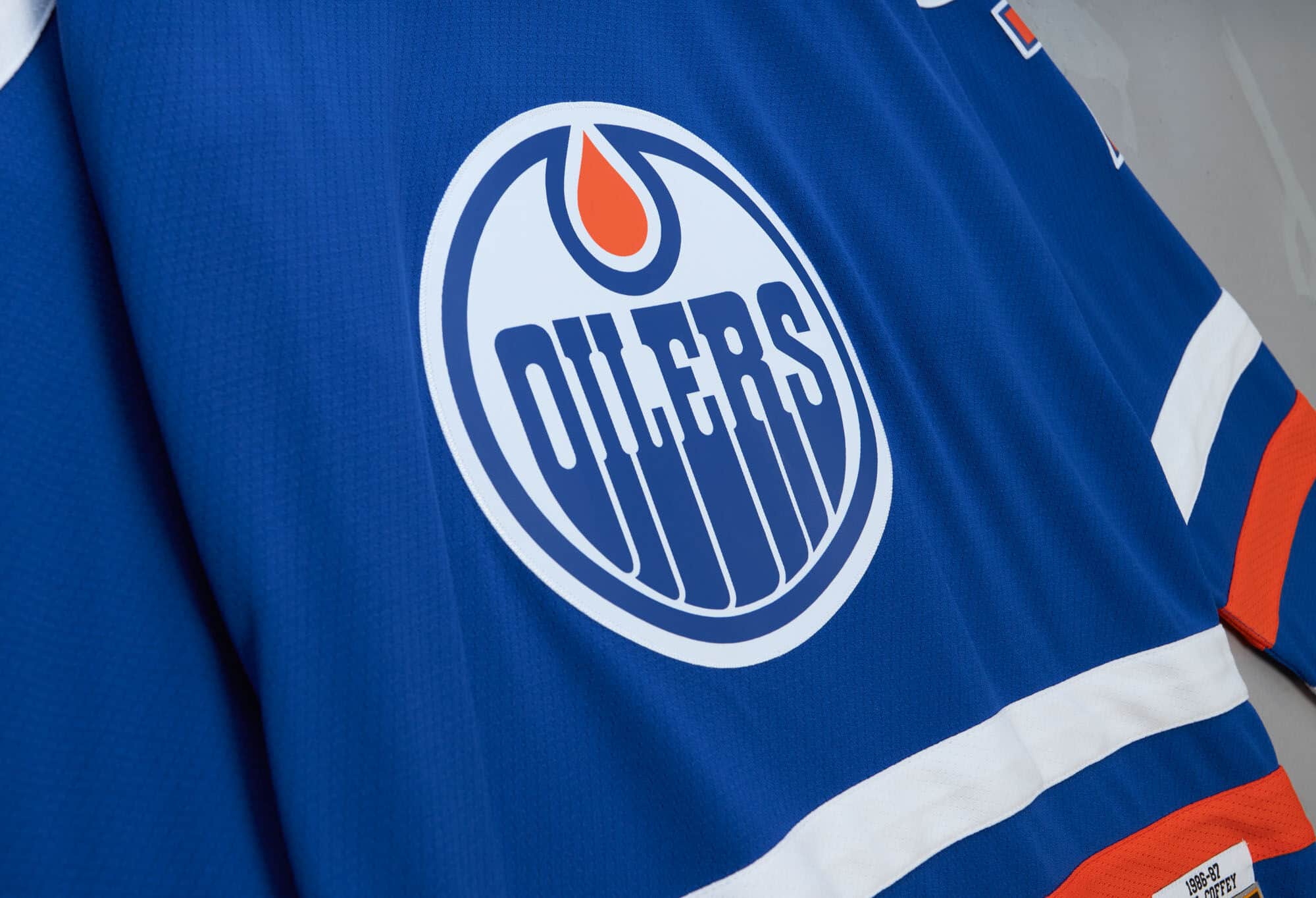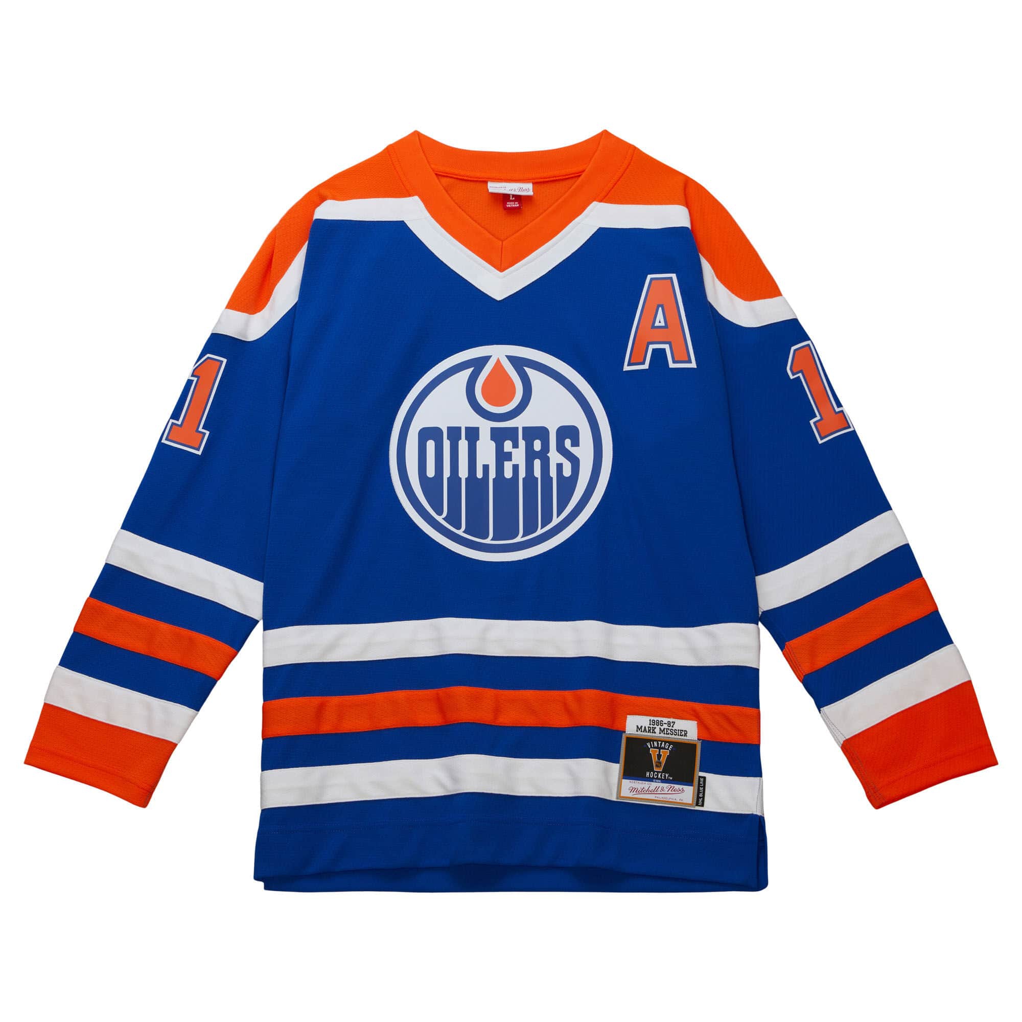 Mitchell & Ness NHL Herren Blue Line Eishockey Trikot von Edmonton Oilers Legende Mark Messier aus der Saison 1986-87.