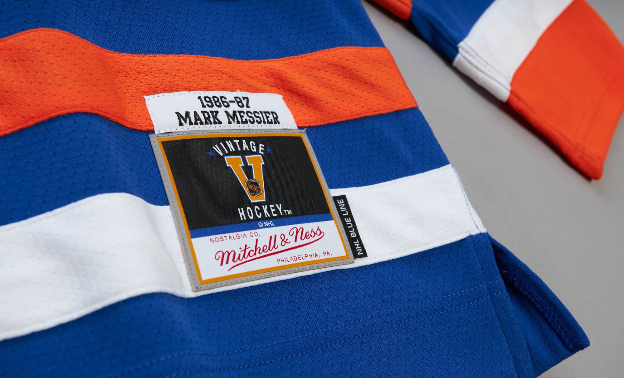 Das Mitchell & Ness Vintage Hockey Label (NHL Blue Line) ist genauso wie der Spielername inklusive Jahrgang am vorderen Saum aufgenäht. Auf der Rückseite sind die Spielernummer 11 und der Spielername MESSIER ebenfalls aufgenäht. Abgerundet wird das klassische Design mit den aufgenähten Nummern auf den Ärmeln.