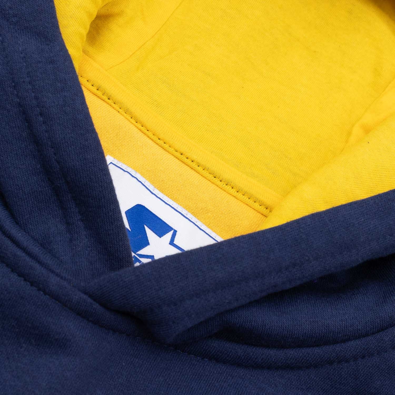 - Teamfarben: Der Hoodie hat einen Korpus in den Primärfarben des Teams mit einer überlappenden Kapuze in passender Farbe. Die Ärmel sind mit Sekundärfarben und weißen Akzenten versehen und sorgen für einen dynamischen Look.