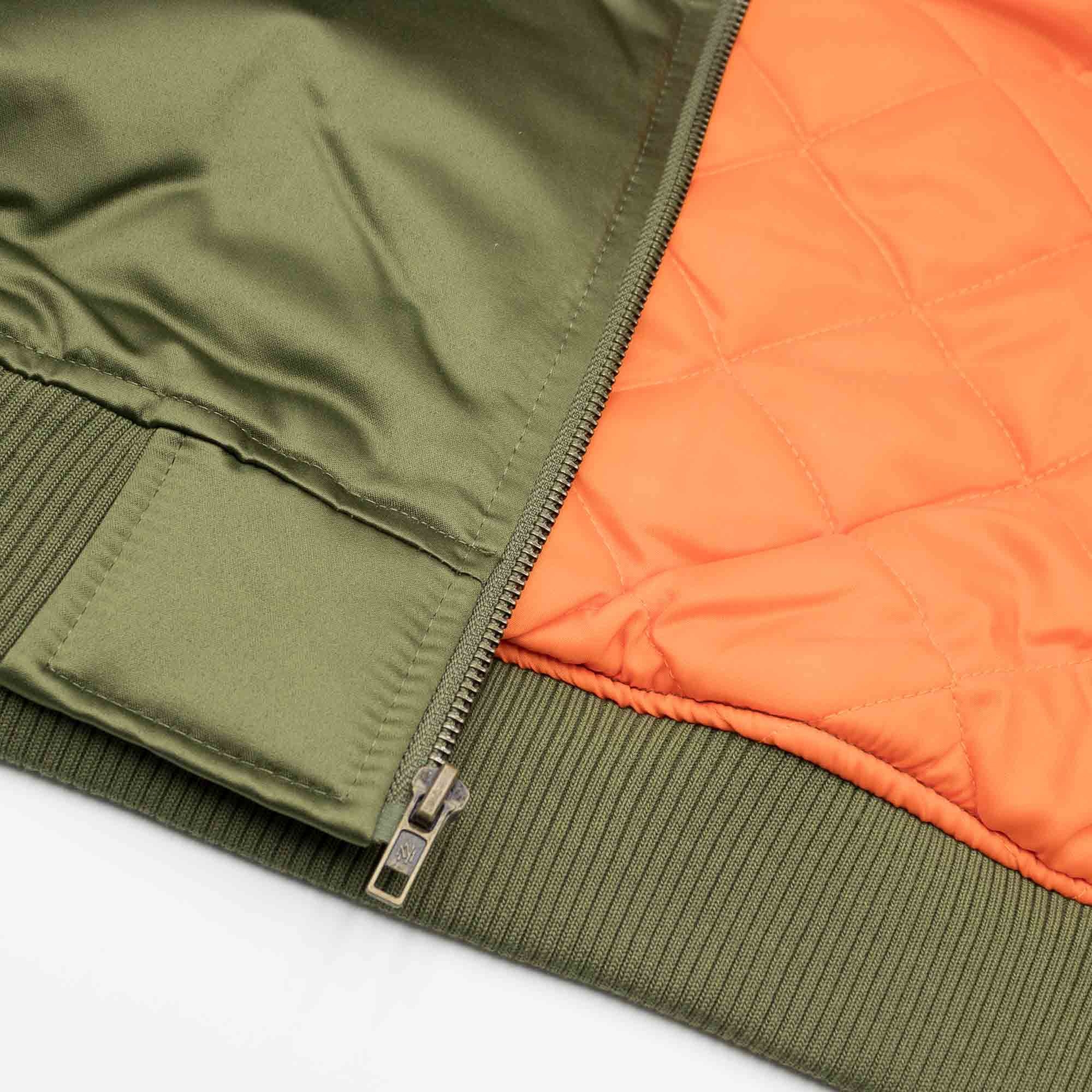 Mitchell & Ness NBA Herren Varsity Jacke von deinen Milwaukee Bucks im olivgrünen Heavyweight Satin Design.