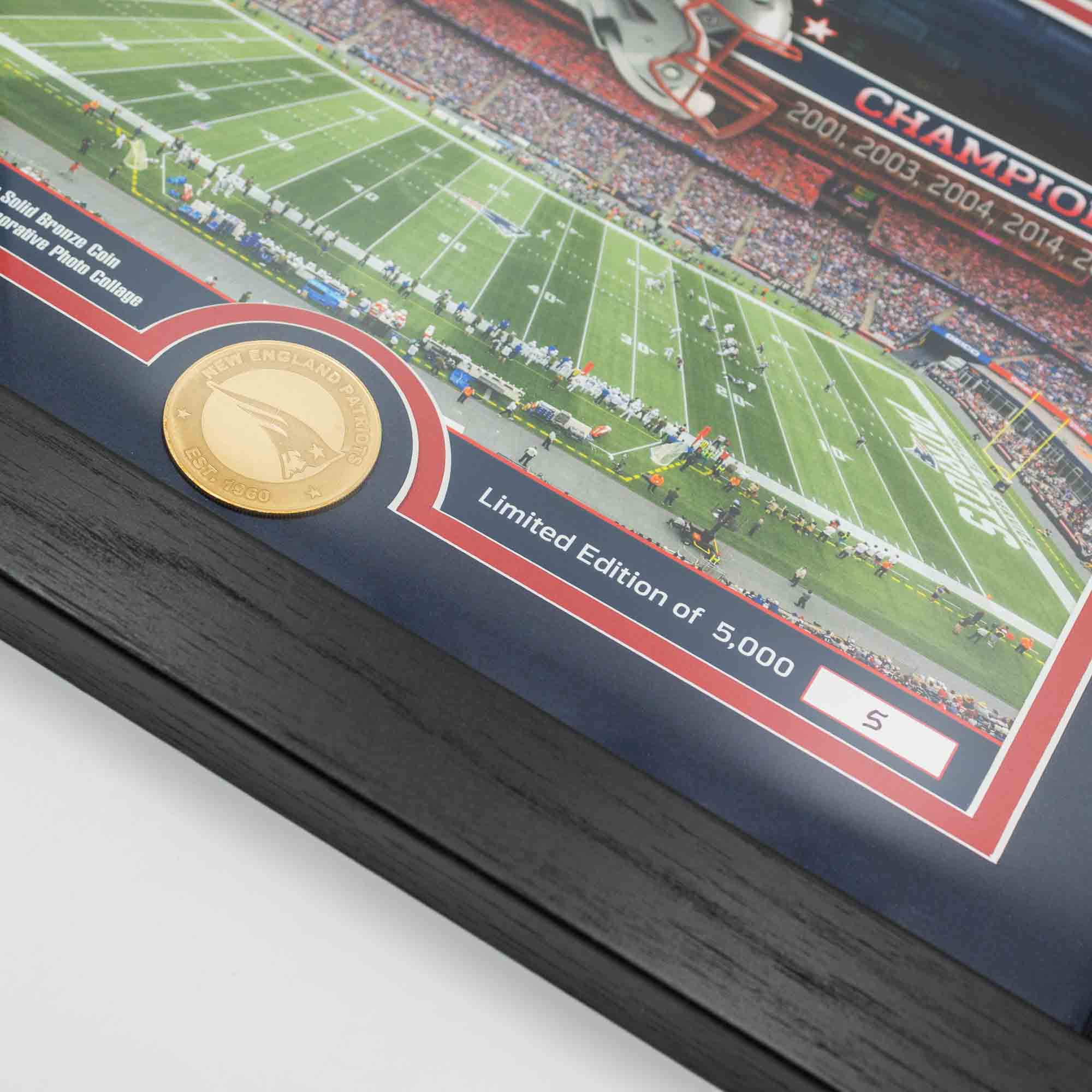 Highland Mint NFL gerahmtes Bild von deinen New England Patriots mit Stadionhintergrund und geprägter Bronzemünze. Limitierte Auflage zu 5.000 Stück.