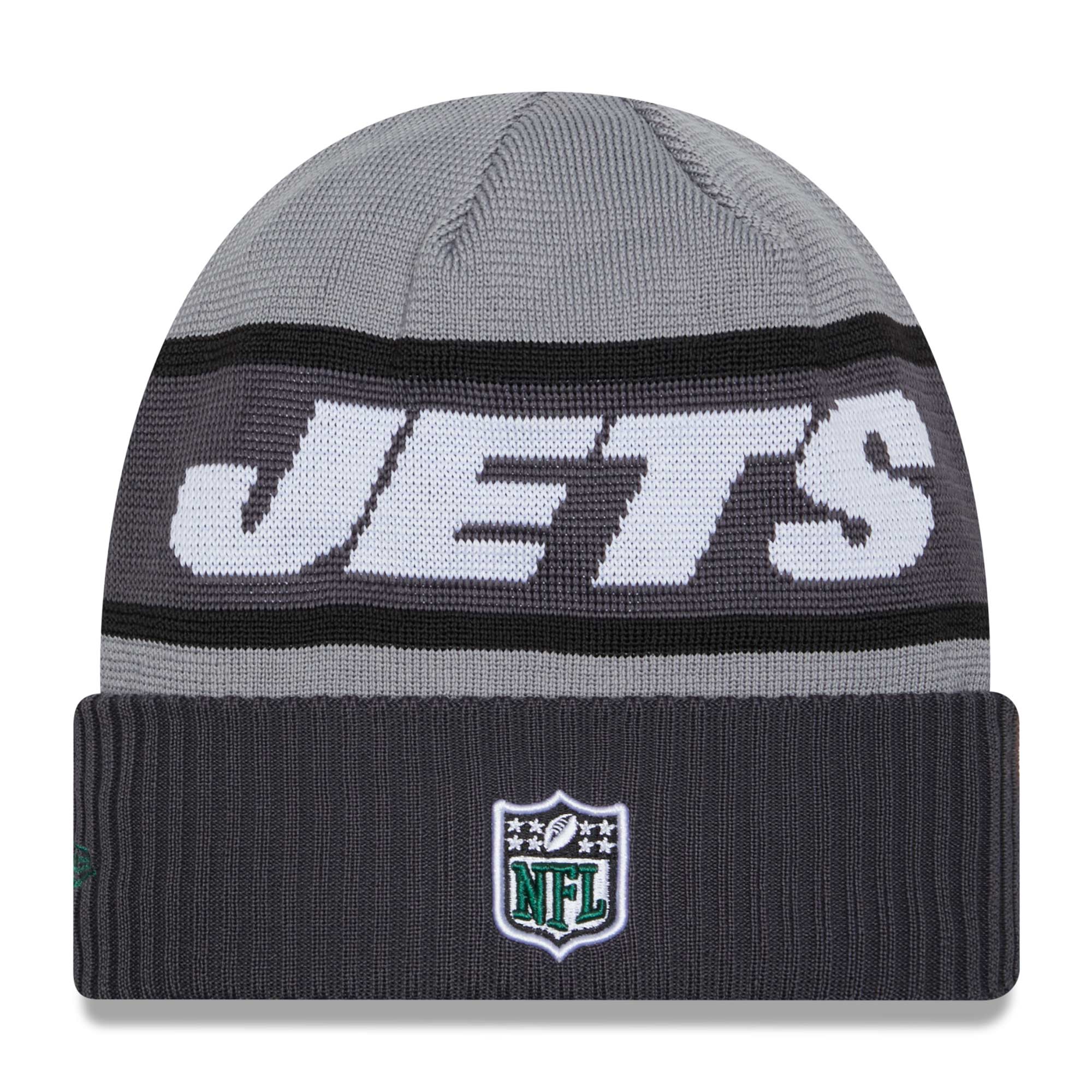 New Era Tech Knit Beanie Wintermütze von deinen New York Jets aus der grauen Colorway 2023 NFL Sideline Kollektion.