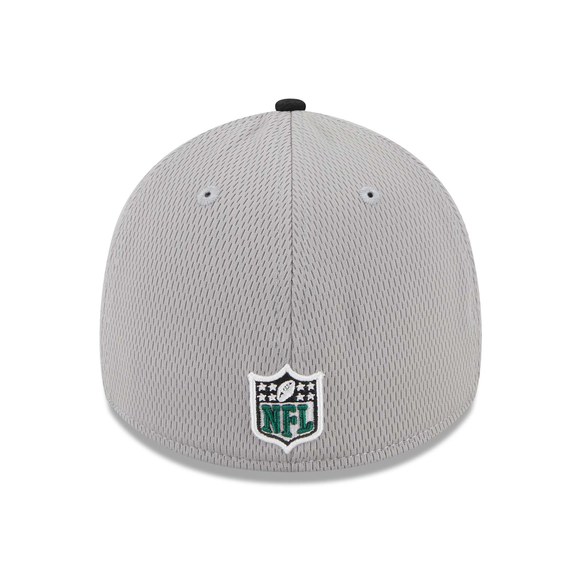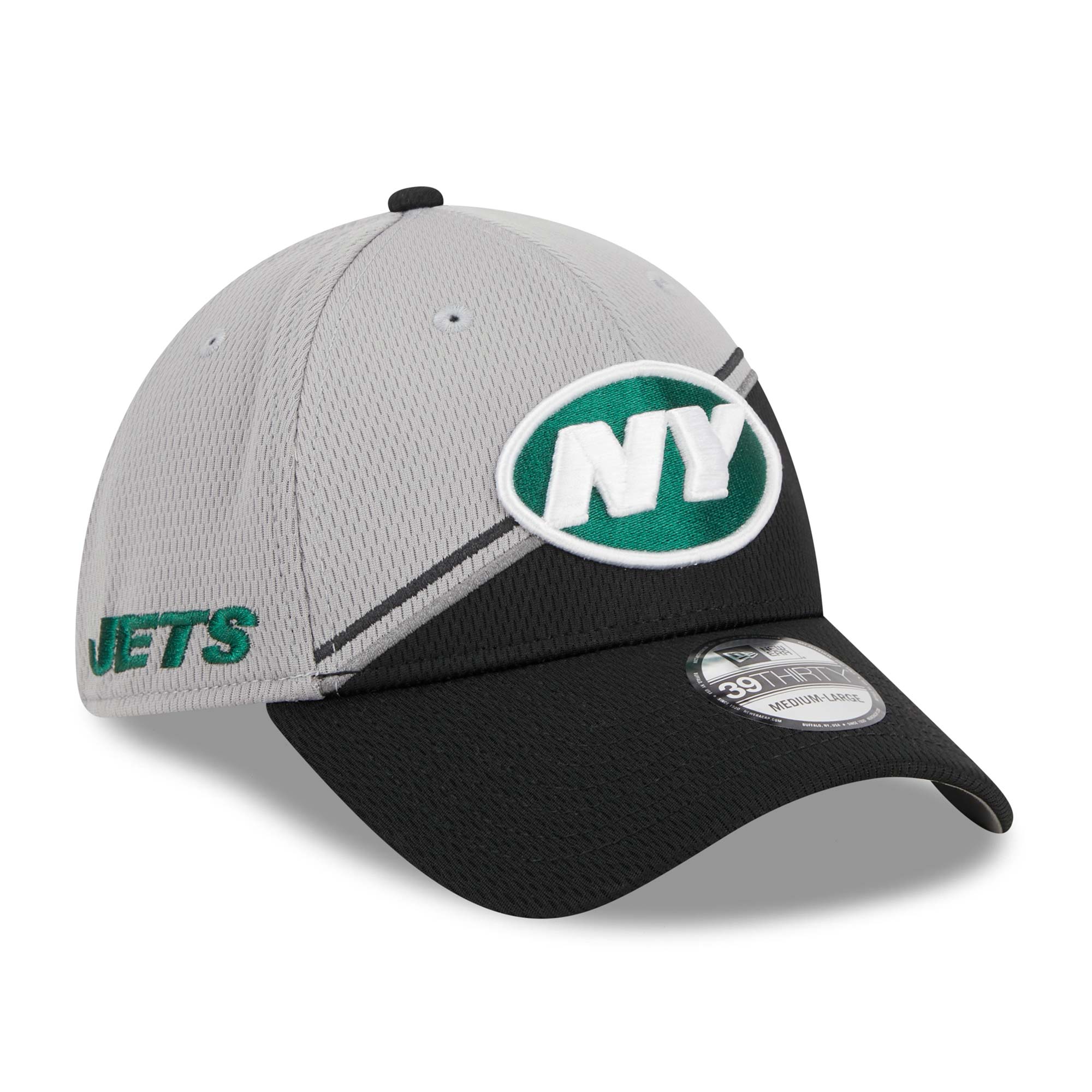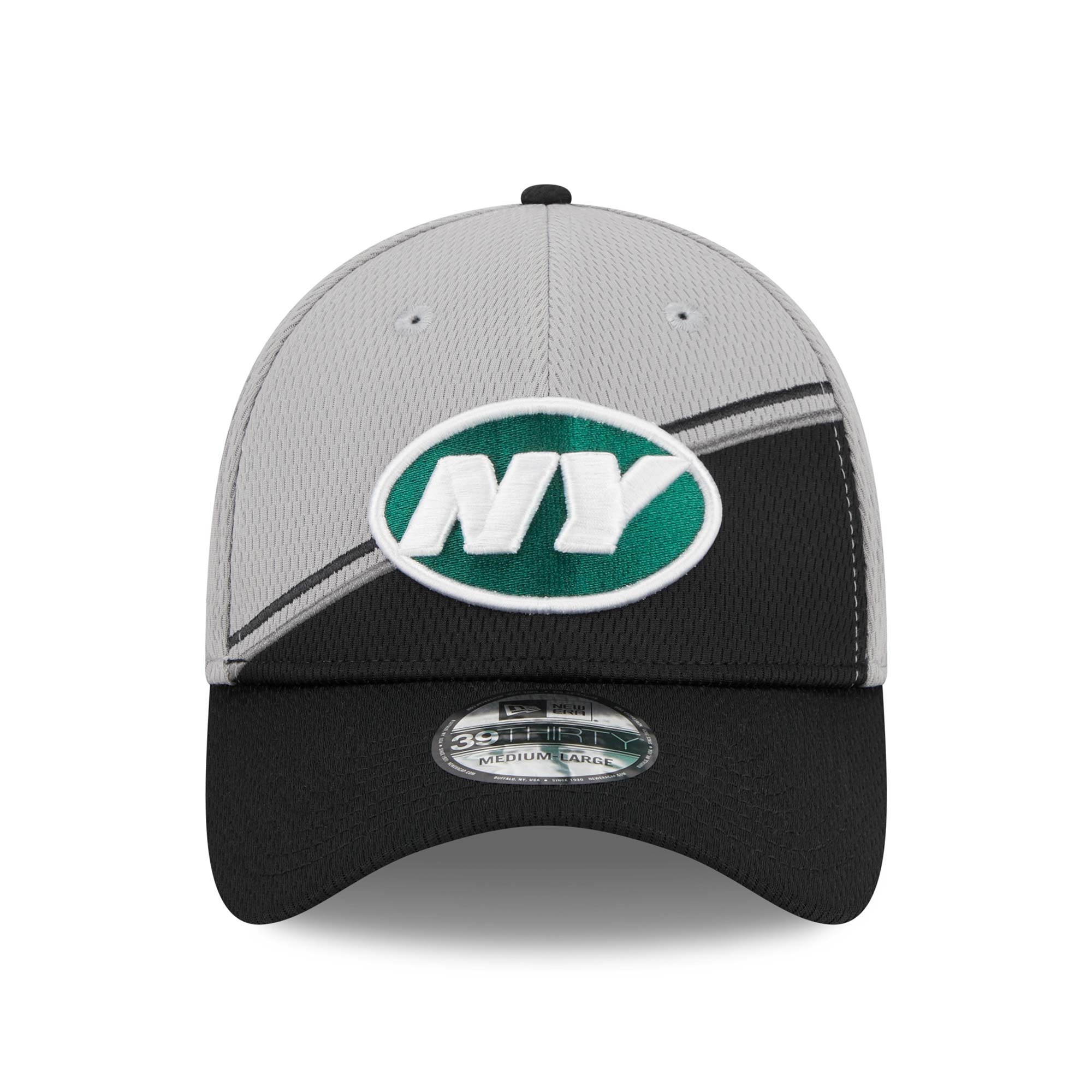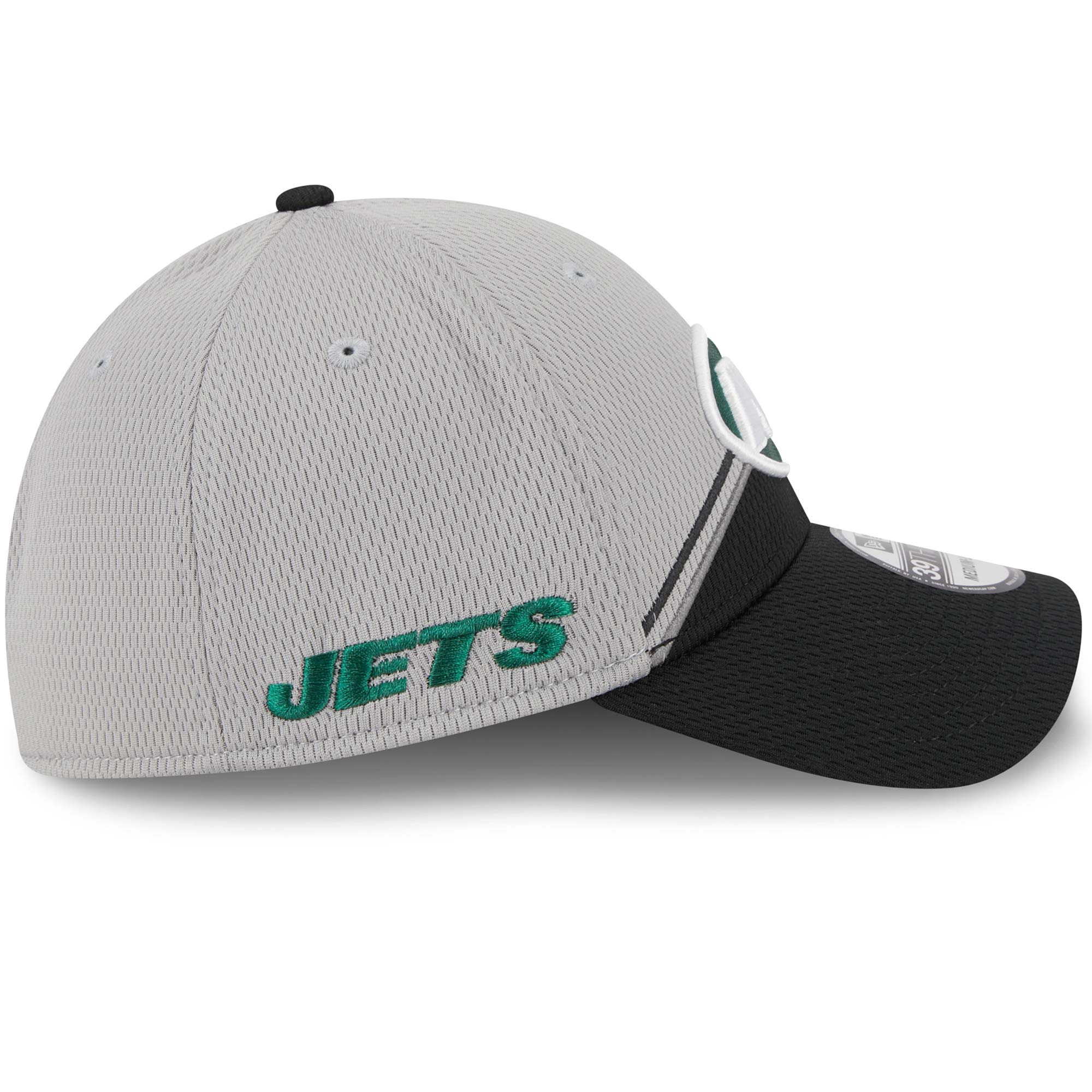 New Era American Football Flex Cap von deinen New York Jets im Stretch-Fit 39THIRTY Style aus der schwarz-grauen Colorway 2023 NFL On Field Sideline Kollektion.