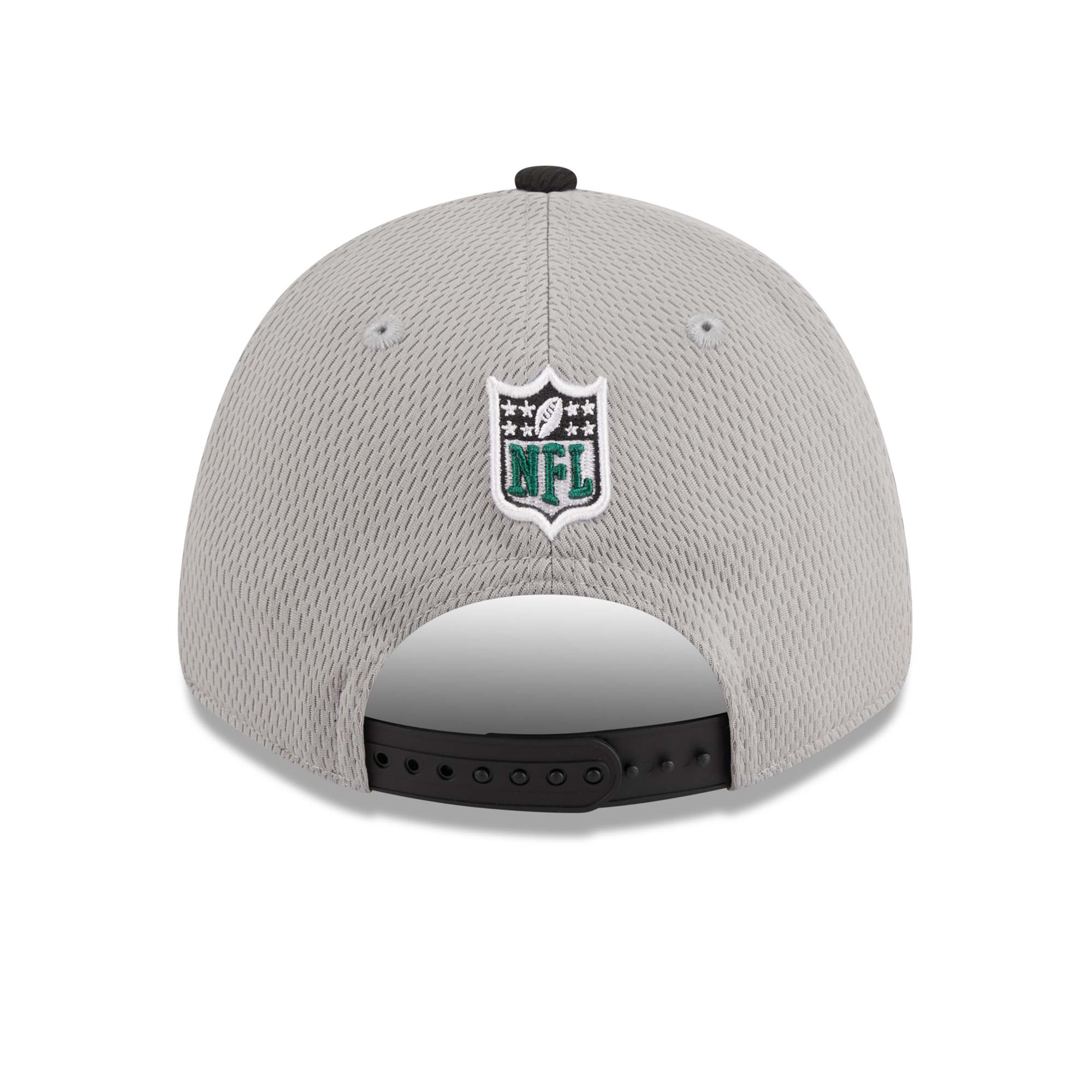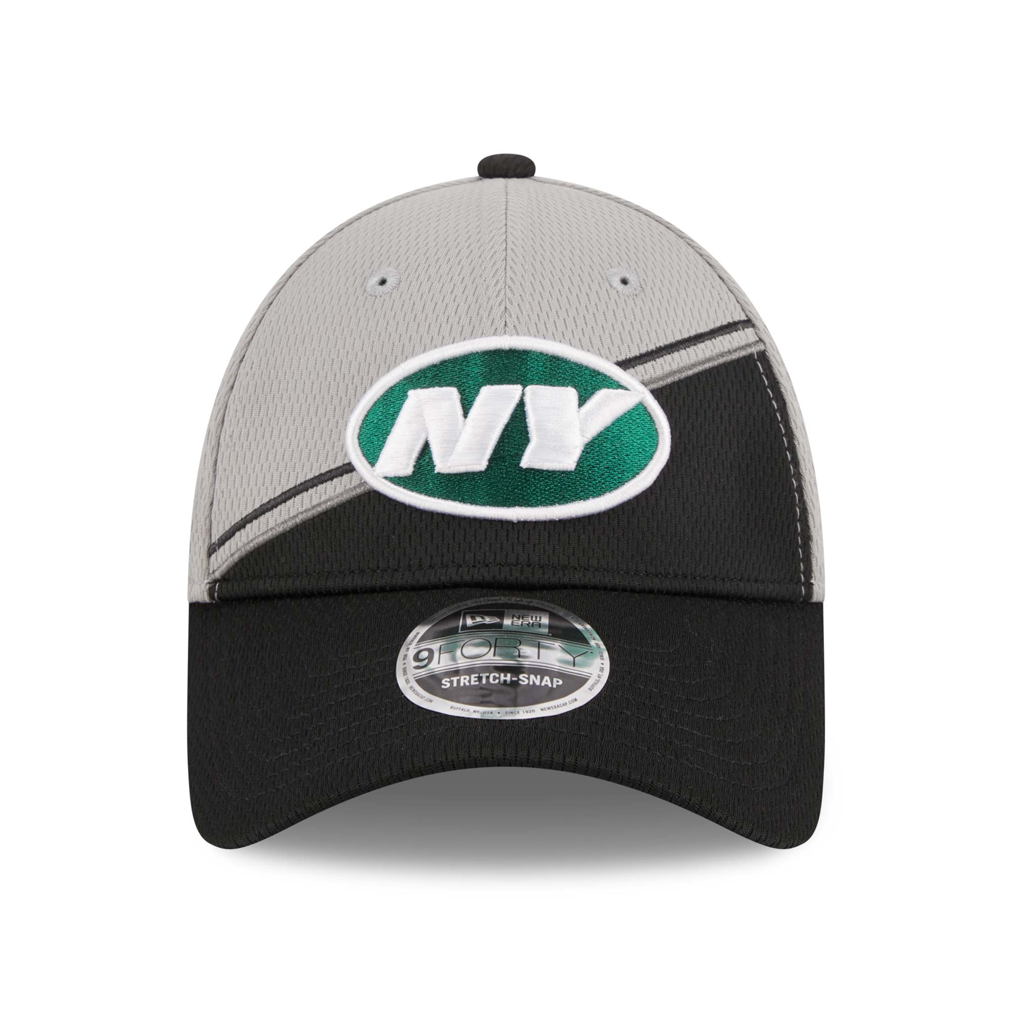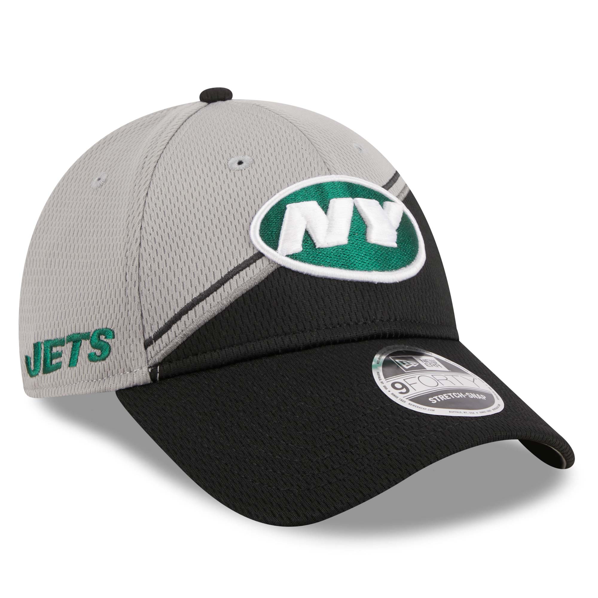 New Era American Football Adjustable Cap von deinen New York Jets im 9FORTY Stretch-Snap Style aus der schwarz-grauen Colorway 2023 NFL On-Field Sideline Kollektion.