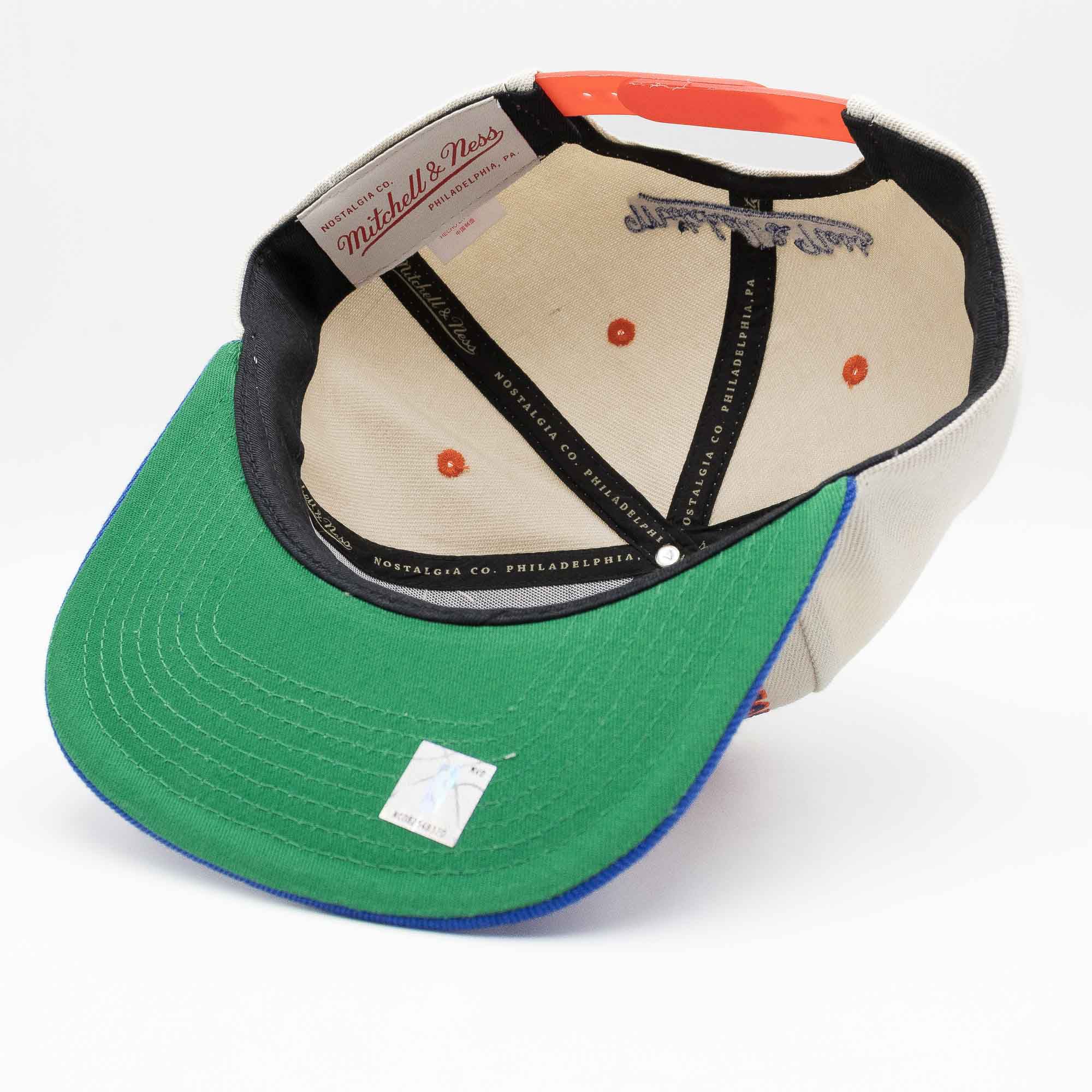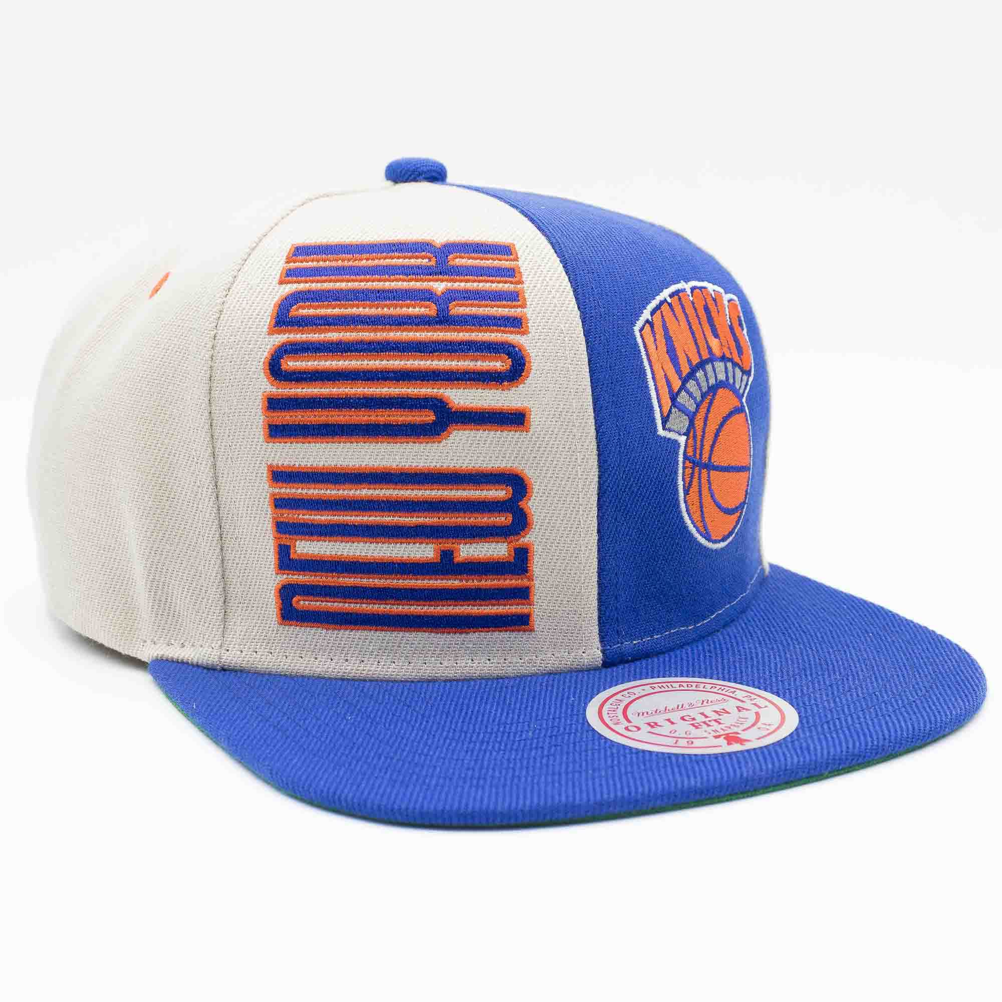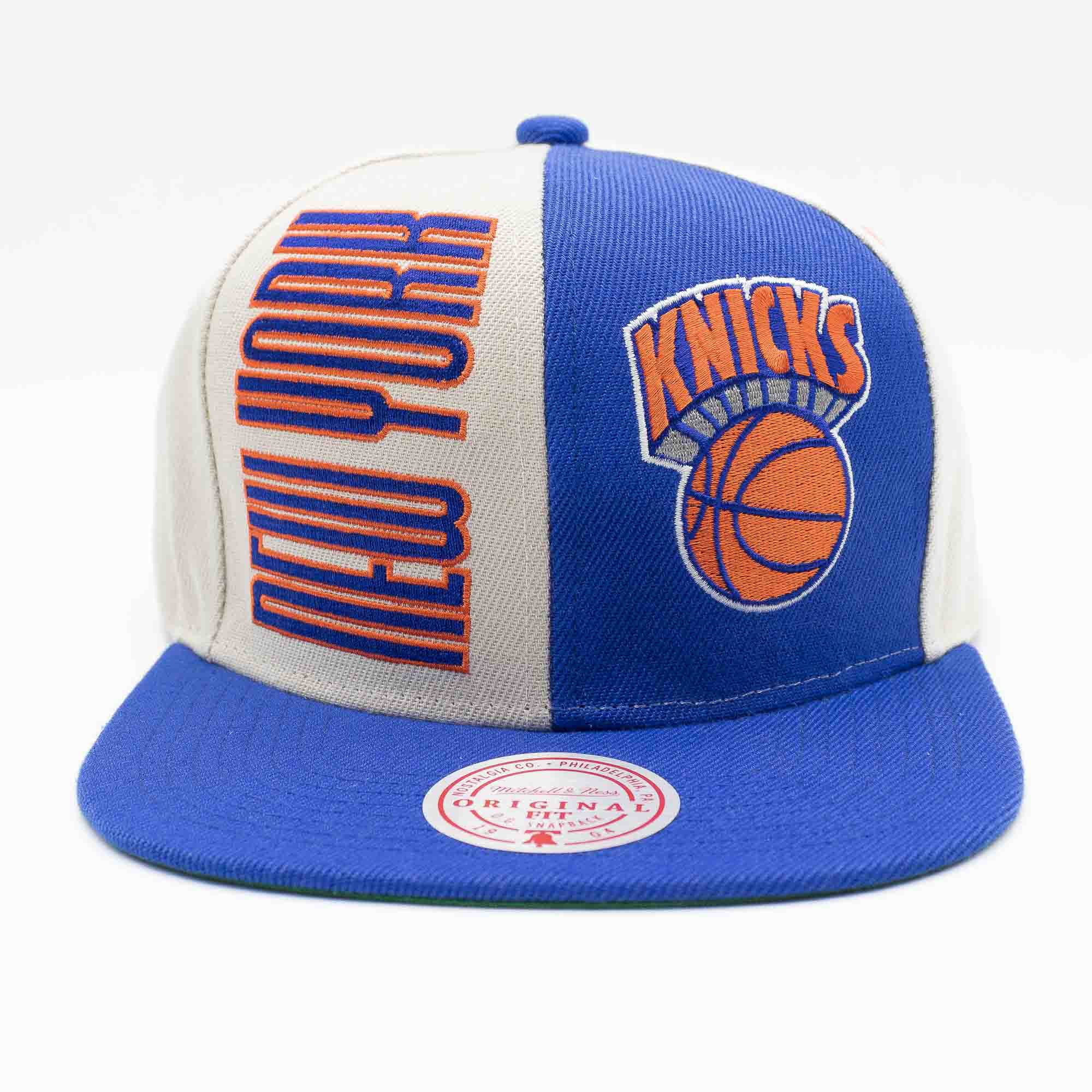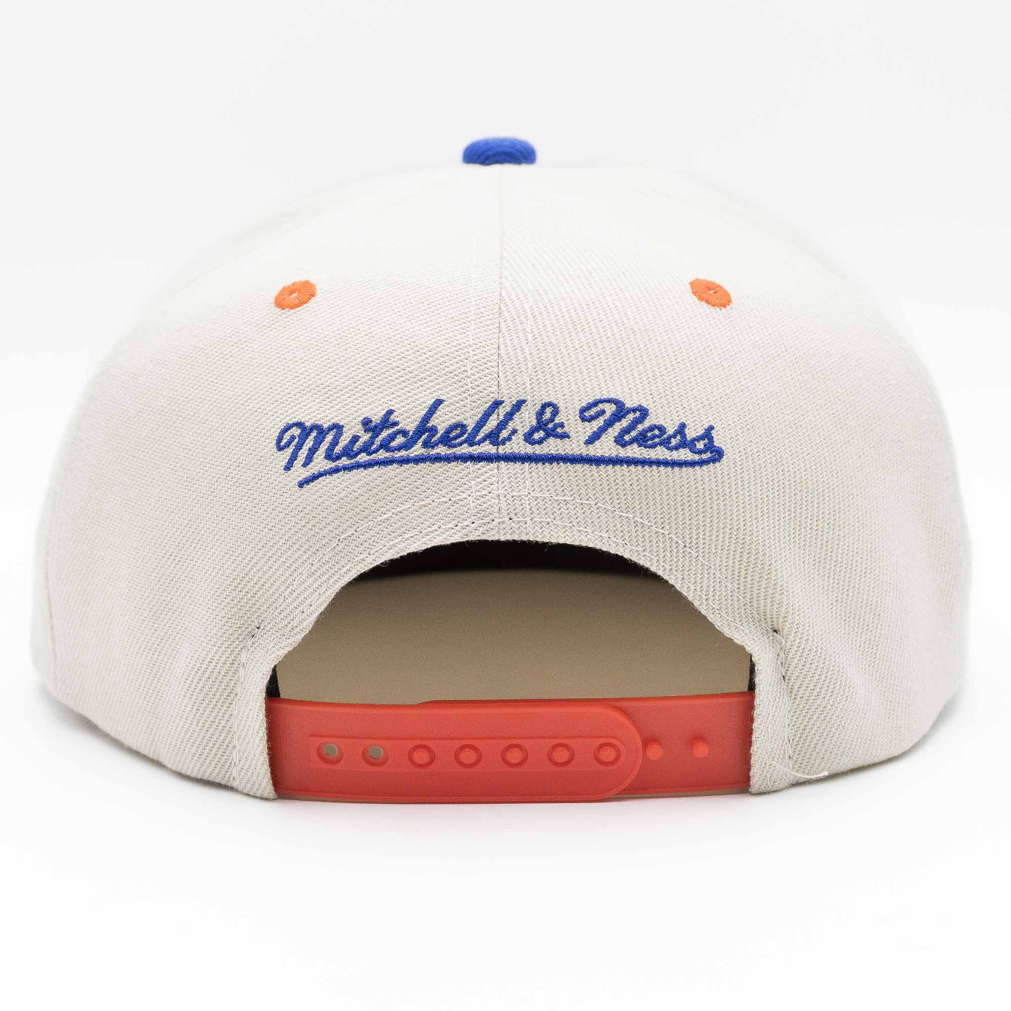 Mitchell & Ness NBA Original Fit Basketball Snapback Cap von den New York Knicks im zweifarbigen Off White Pop Panel Design.