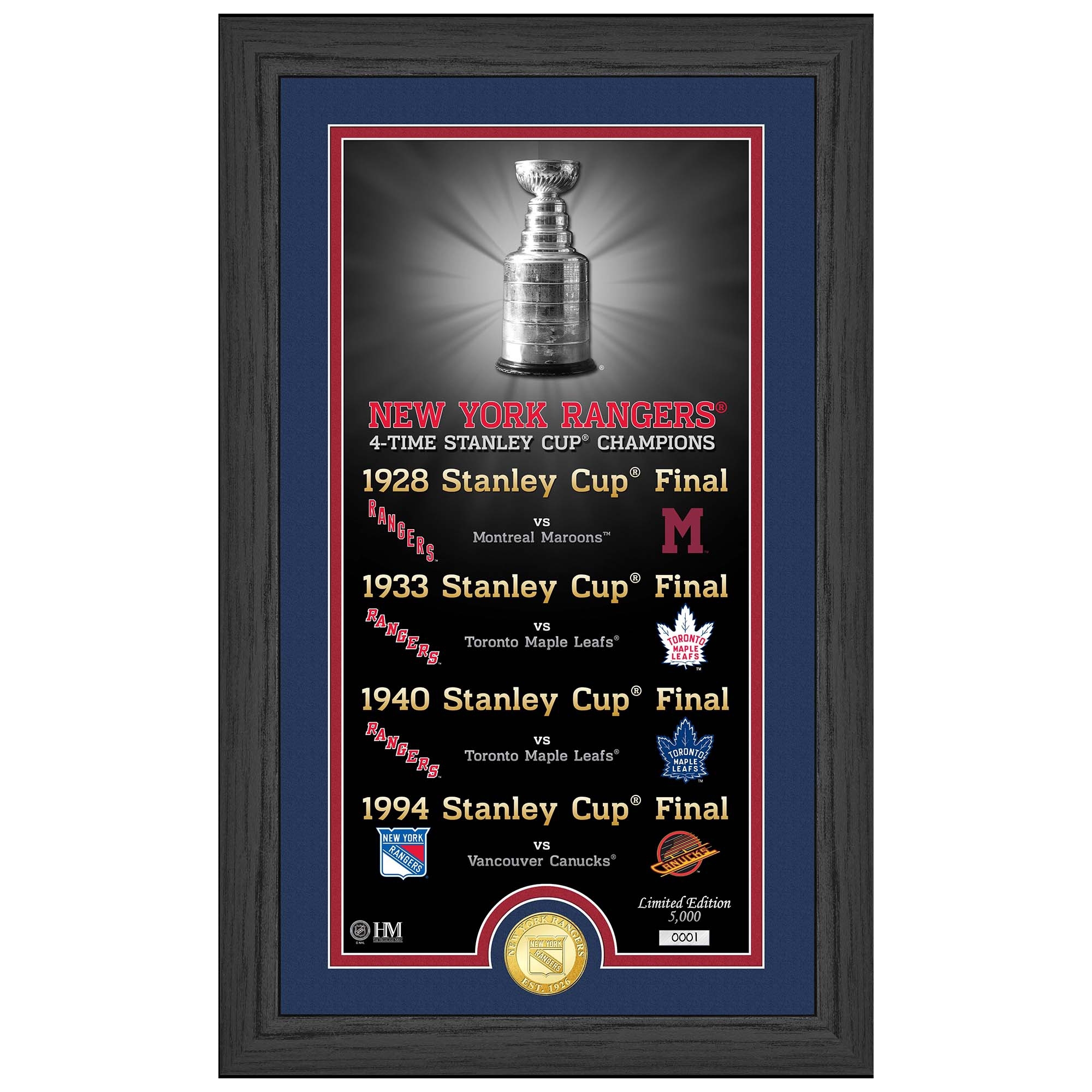 Eine limitierte Auflage zum Gedenken an den vierfachen Stanley-Cup-Sieger New York Rangers! Dieser 30 x 50 cm große Rahmen mit doppelter Mattierung und einer Glasfrontplatte verfügt über ein individuell nummeriertes 38 x 17 cm großes Erinnerungsfoto, auf dem jeder ihrer Stanley Cup Championships aufgeführt ist, sowie eine geprägte 39-mm-Gedenkmünze aus massiver Bronze des Teams.