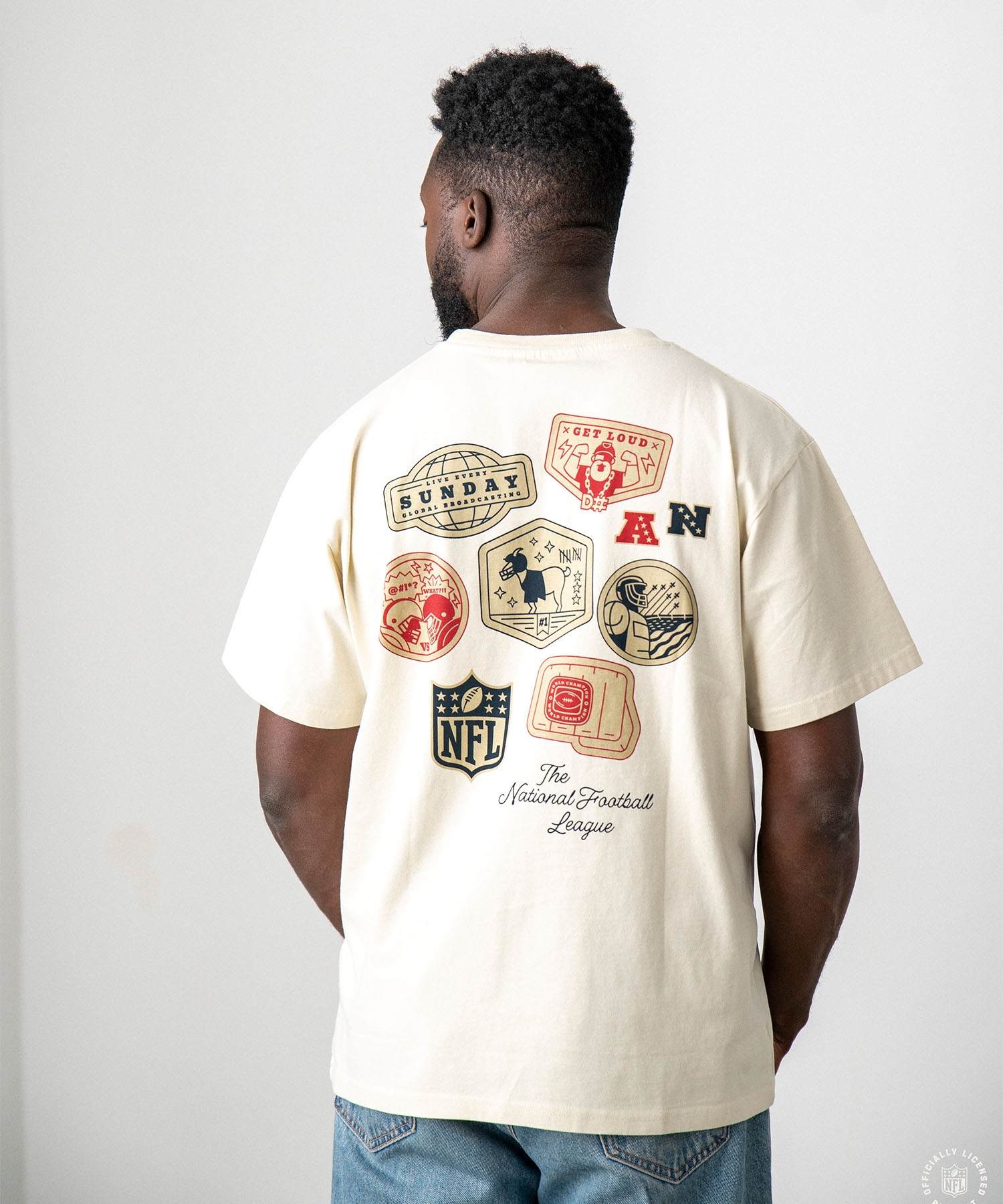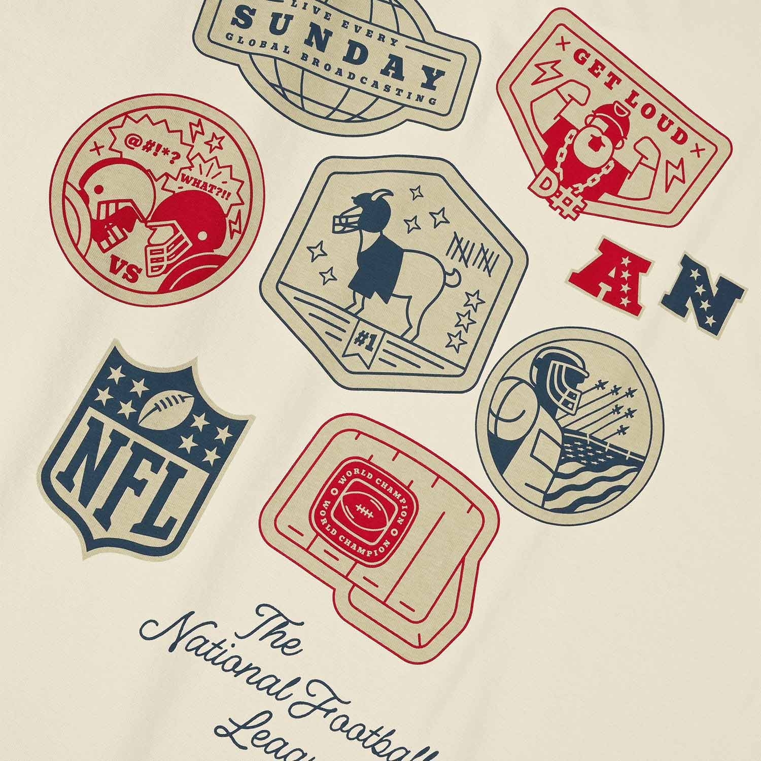 Der markante Rückenprint kombiniert Sticker-Motive wie „Get Loud", „Sunday Broadcasting", Conference-Logos und das NFL Shield zu einem unverwechselbaren Retro-Design, das den Spirit der Liga perfekt einfängt.