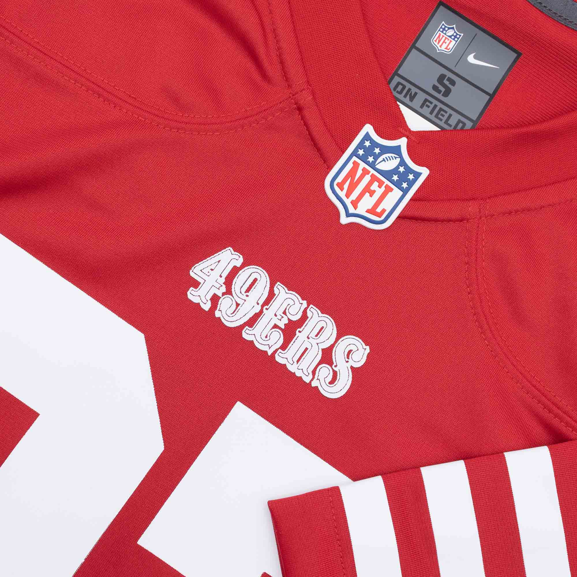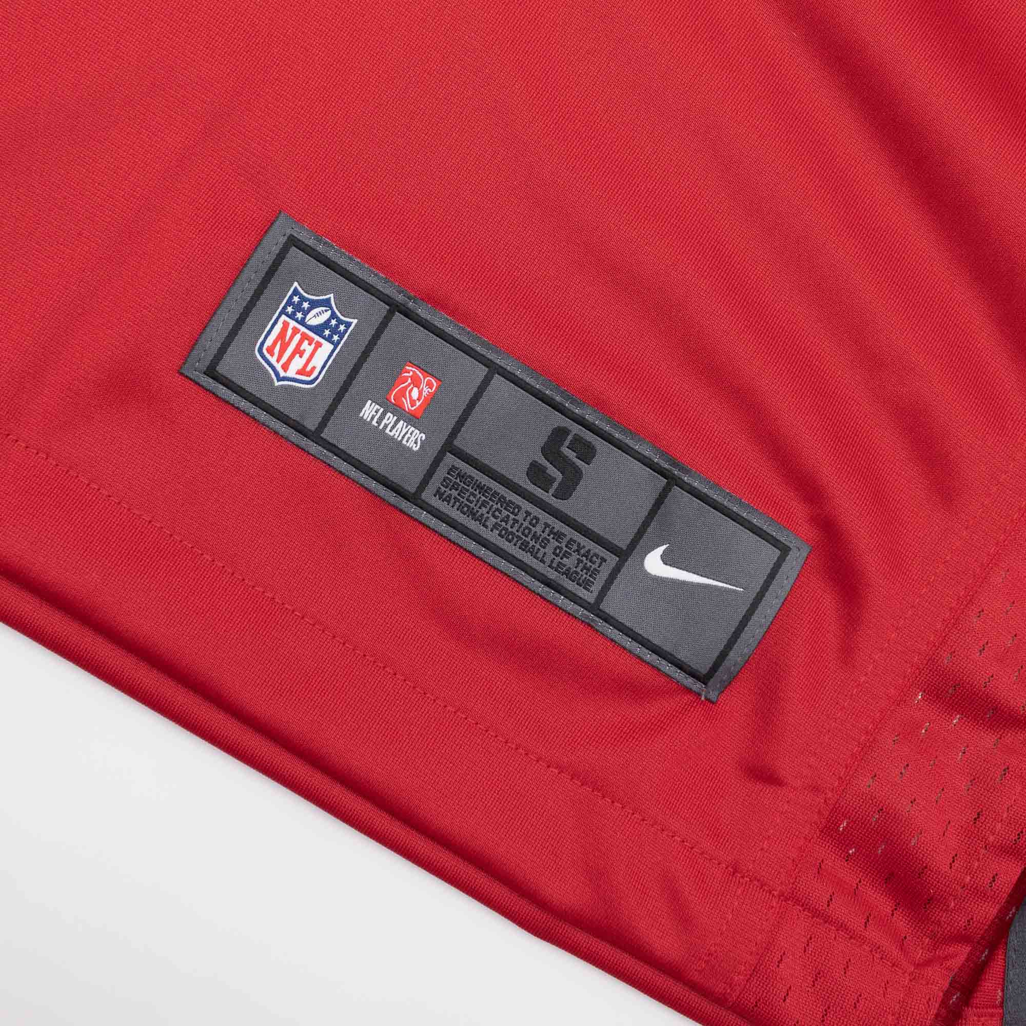 Die Game NFL Trikots sind in hochwertiger Nike-Qualität produziert und sind ein absolutes Must-Have für jeden passionierten American Football Fan. Dieses San Francisco 49ers NFL Fan-Trikot besteht zu 100% aus Polyester. Alle Logos, Ziffern und Buchstaben sind hochwertig aufgedruckt (Screen-Printed) und entsprechen dem offiziellen Design der original NFL-Spieltrikots. Das Trikot hat die Nummer 97 und den Spielernamen BOSA aufgedruckt, das Nameplate ist sogar extra aufgenäht. Das NFL-Shield am Kragen ist genauso wie das Equipment-Label am Saum aufgenäht. Zusätzlich sind die Ärmel mit den ikonischen drei Streifen bedruckt. Der Nackenbereich ohne störendes Etikett sorgt für optimierten Tragekomfort. Egal ob am Spieltag oder im Alltag - Mit deinem Nick Bosa Niners Trikot zeigst Du ganz klar welches Team Du unterstützt: Faithful to the Bay!