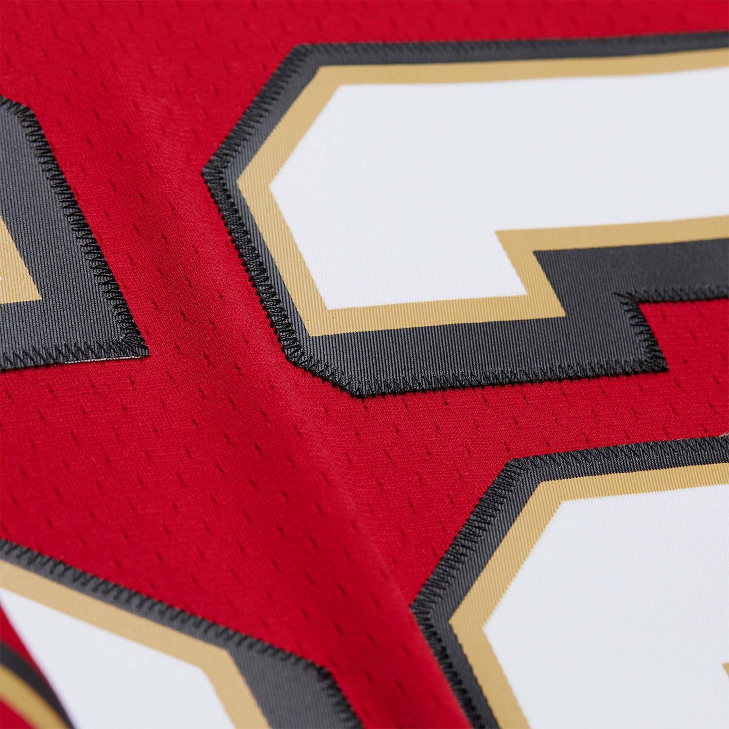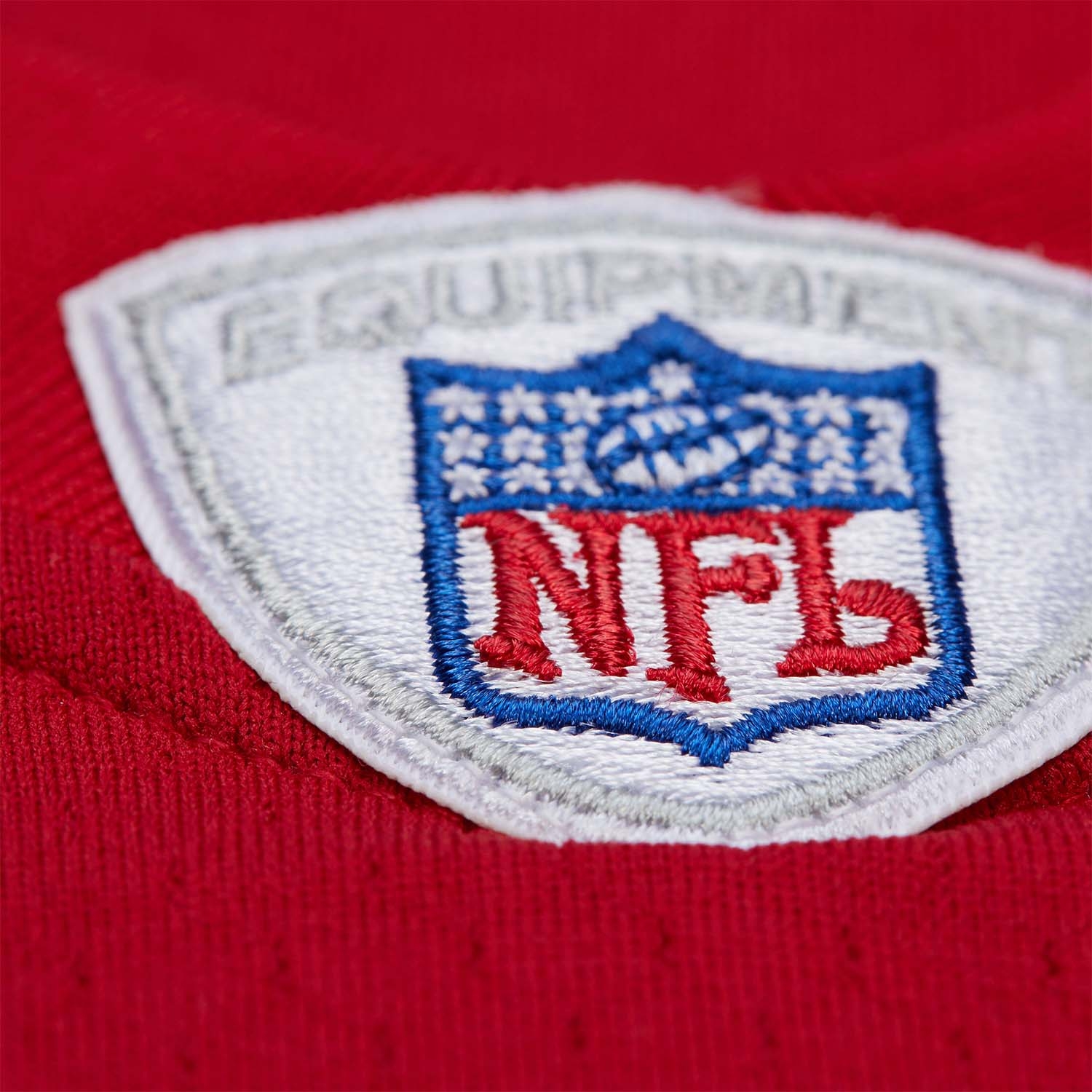 Aufgenähte Nummern, Namenszug und Logos entsprechen dem offiziellen NFL-Design der San Francisco 49ers aus dem Jahr 2007. Das gestickte NFL Shield am Kragen sowie das Mitchell & Ness Legacy Collection Label am Saum runden das authentische Gesamtbild ab.