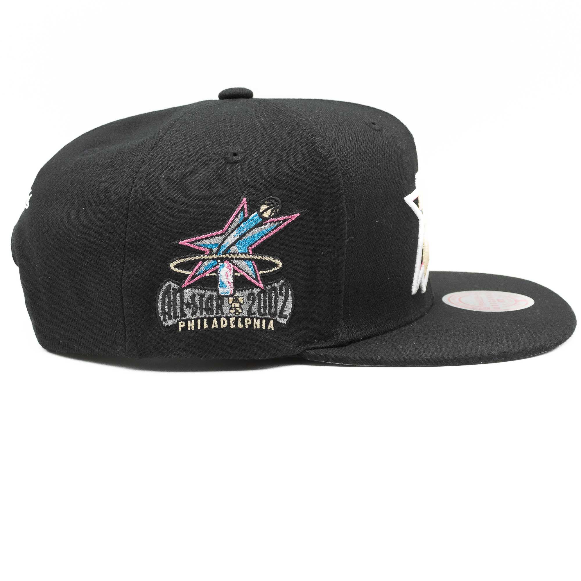 Die klassische Mitchell and Ness Basketball Snapback Cap kommt im edlen, schwarzen Design und hochwertig aufgestickten Logos. Die Vorderseite der Cap ist prominent mit dem Philadelphia 76ers Teamlogo im 3D-Design bestickt. Zusätzlich ziert die rechte Capseite der 76ers All-Star 2002 Patch. Abgerundet wird der Snapback Look mit dem Mitchell & Ness Schriftzug auf der Rückseite und der grauen Schirmunterseite.