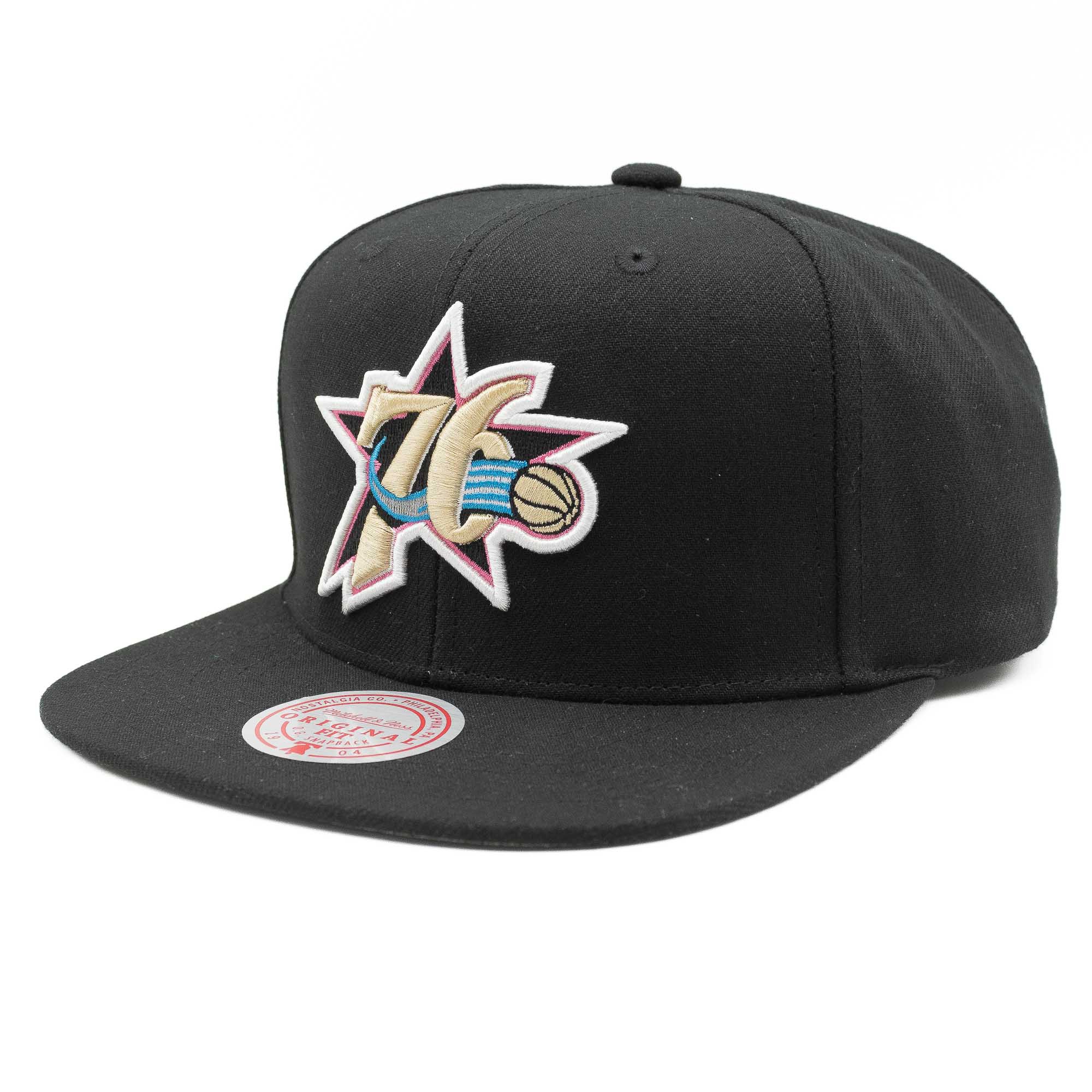 Mitchell & Ness NBA Original Fit Basketball Snapback Cap von deinen Philadelphia 76ers im Neon Tropical Style mit All-Star 2002 Side Patch.