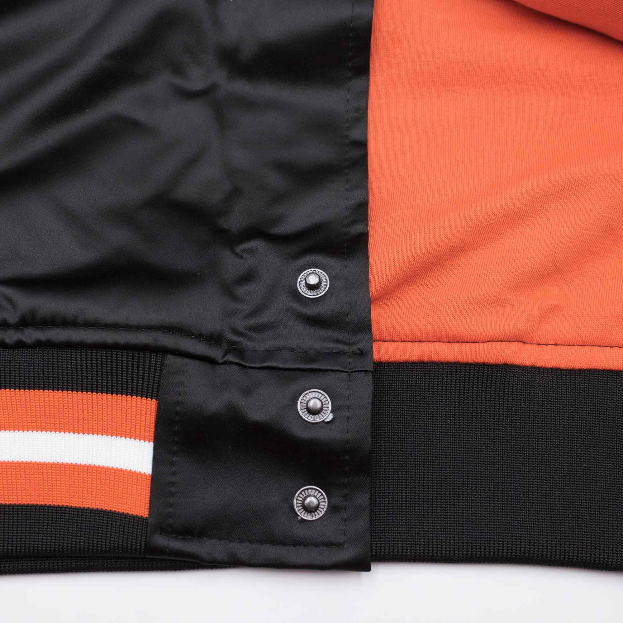 Premium Mitchell & Ness Philadelphia Flyers Retro Jacke mit klassischer Satin-Außenhülle aus der offiziellen NHL Kollektion. Die NHL Jacke hat zwei äußere Taschen, eine Innentasche und eine durchgehende Knopfleiste. Das Design ist den amerikanischen College und High School Jacken nachempfunden und der Mitchell & Ness Schriftzug ist wie immer am rechten Ärmelsaum aufgestickt. Auf der Front sind der Chicago Blackhawks Schriftzug und das Teamlogo hochwertig aufgenäht. Unter dem Kragen auf der Innenseite ist das Mitchell & Ness Logo aufgenäht. Das weiche Jersey-Inlay sorgt für ein absolut angenehmes Tragegefühl. Mit dem eindeutigen Eishockey Style ist diese leichte Jacke ein perfekter Begleiter für die Übergangszeit im Herbst, Frühling oder in kühlen Sommernächten.