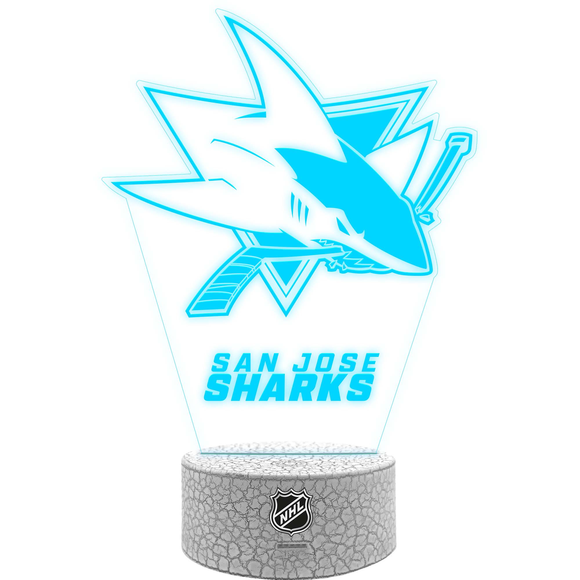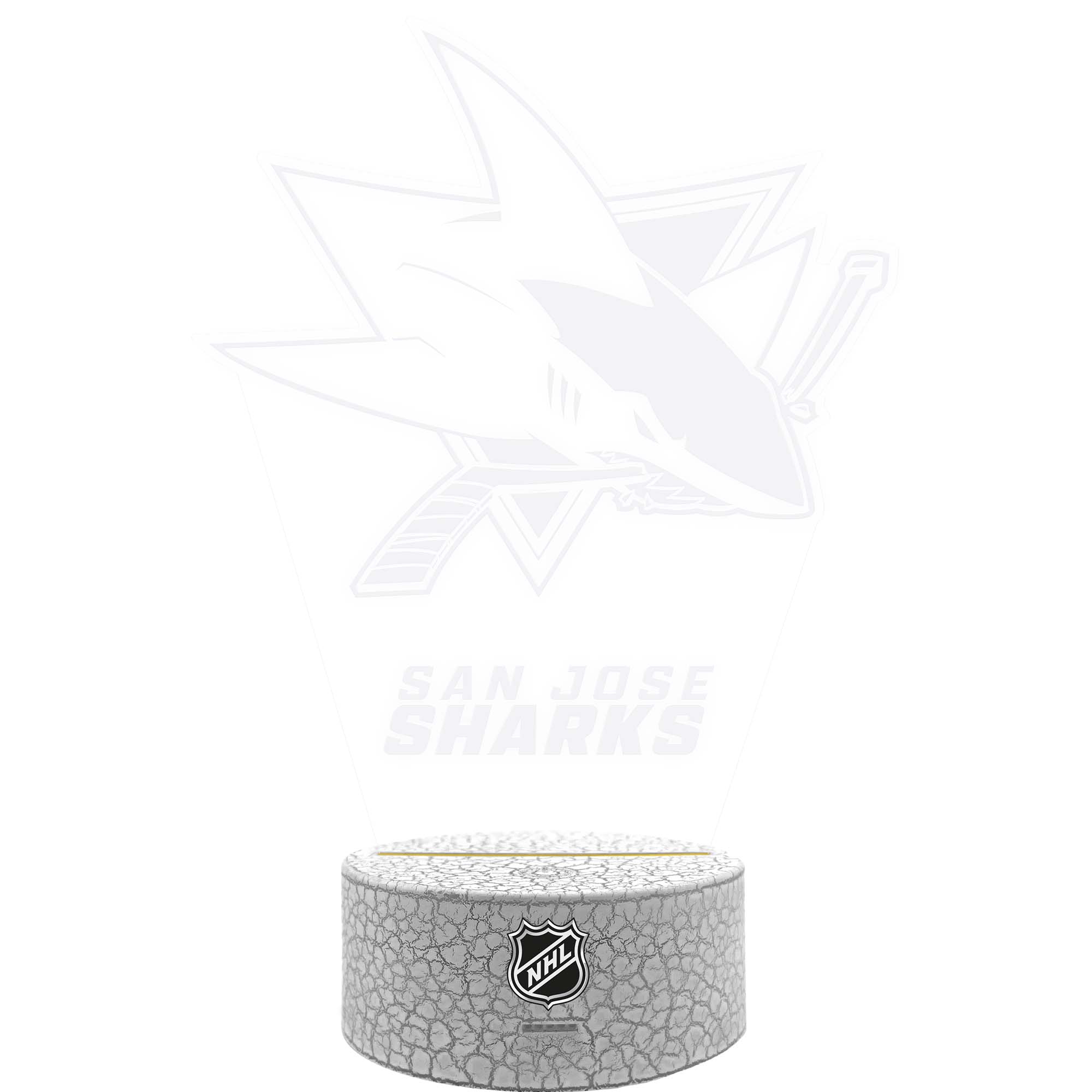 Das LED Team Logo Schild lässt alle NHL-Augen aufleuchten! Das lasergravierte Acrylschild kommt im authentischen Eishockey Design inklusive San Jose Sharks Team Logo. Das Leuchtschild wird einfach mit der mitgelieferten NHL-Base zusammengesteckt und kann mit der Multi-Color LED in zwei verschiedenen Farben zum Leuchten gebracht werden. Du kannst deine Lieblingsfarbe einstellen oder einen durchlaufen Farbwechsel einstellen. Mit USB-Anschluss und der zusätzlichen Batteriefunktion kann das Leuchtschild einfach und praktisch eingesetzt werden. Aber auch unbeleuchtet macht das Schild richtig was her und sollte in keinem NHL-Fancave fehlen.