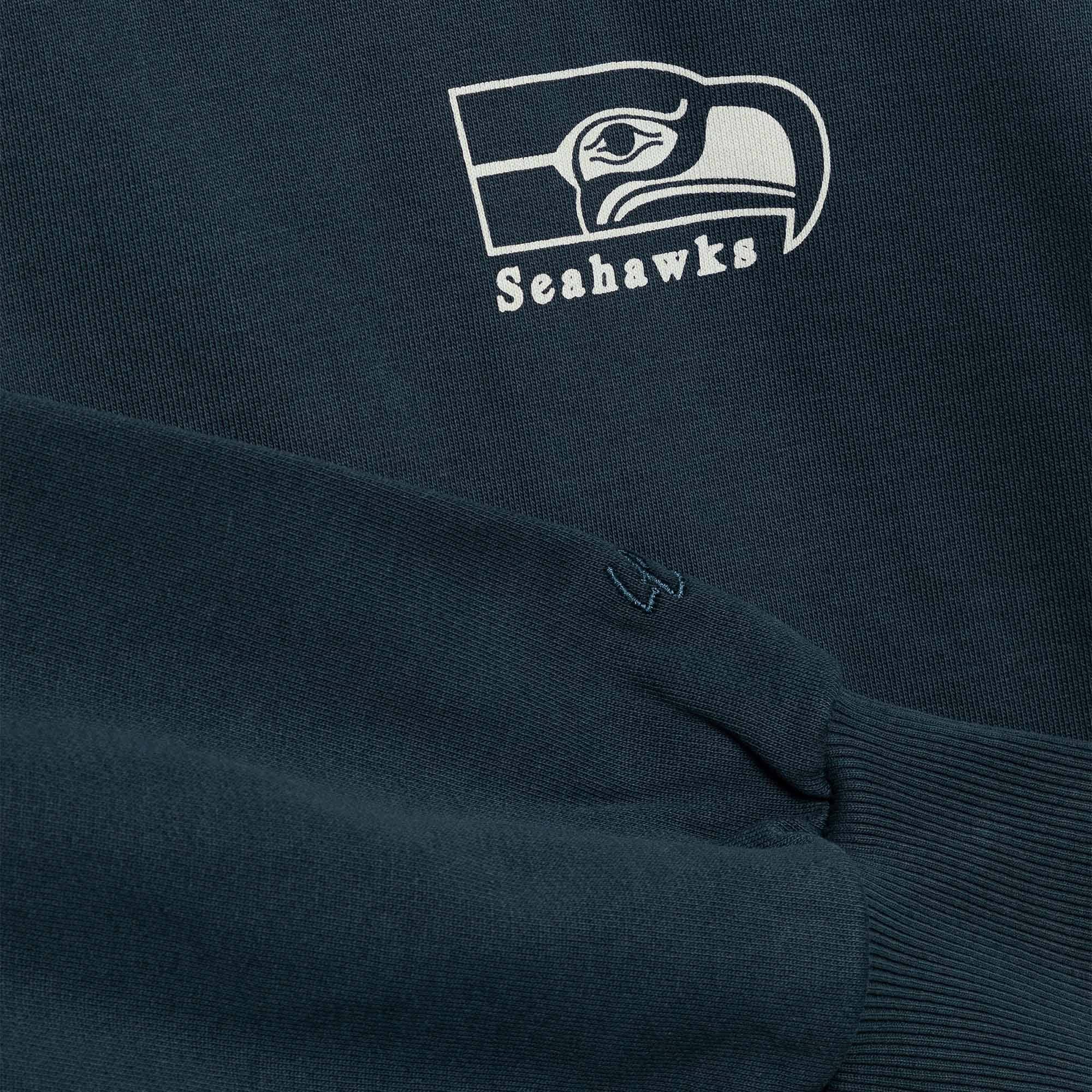 - Klassischer Seahawks-Stil: Der Sweater zeigt einen großflächigen Seattle Seahawks Backprint inklusive des klassischen Teamlogos. Dieses findet sich auch als kleiner Print auf der linken Brust wieder.