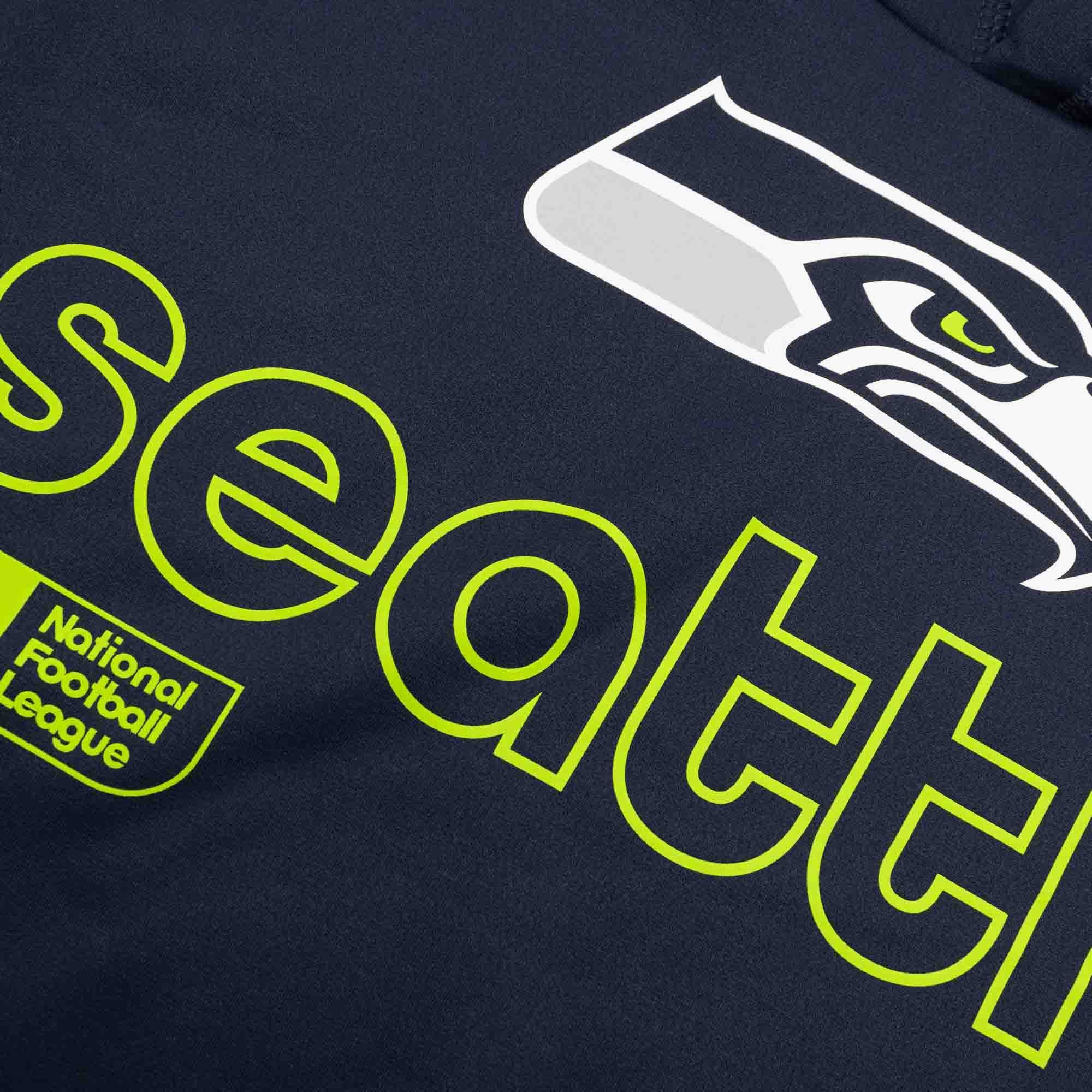 Der Pullover ist auf der Vorderseite mit dem ikonischen Seattle Seahawks Logo und dem stilisierten „Seattle" Schriftzug auf der Brust versehen, was dem Hoodie einen modernen und gleichzeitig zeitlosen Look verleiht. Der Nike Swoosh auf dem Ärmel rundet das sportliche Design ab und macht diesen Hoodie zu einem Must-Have für jeden echten NFL-Fan.