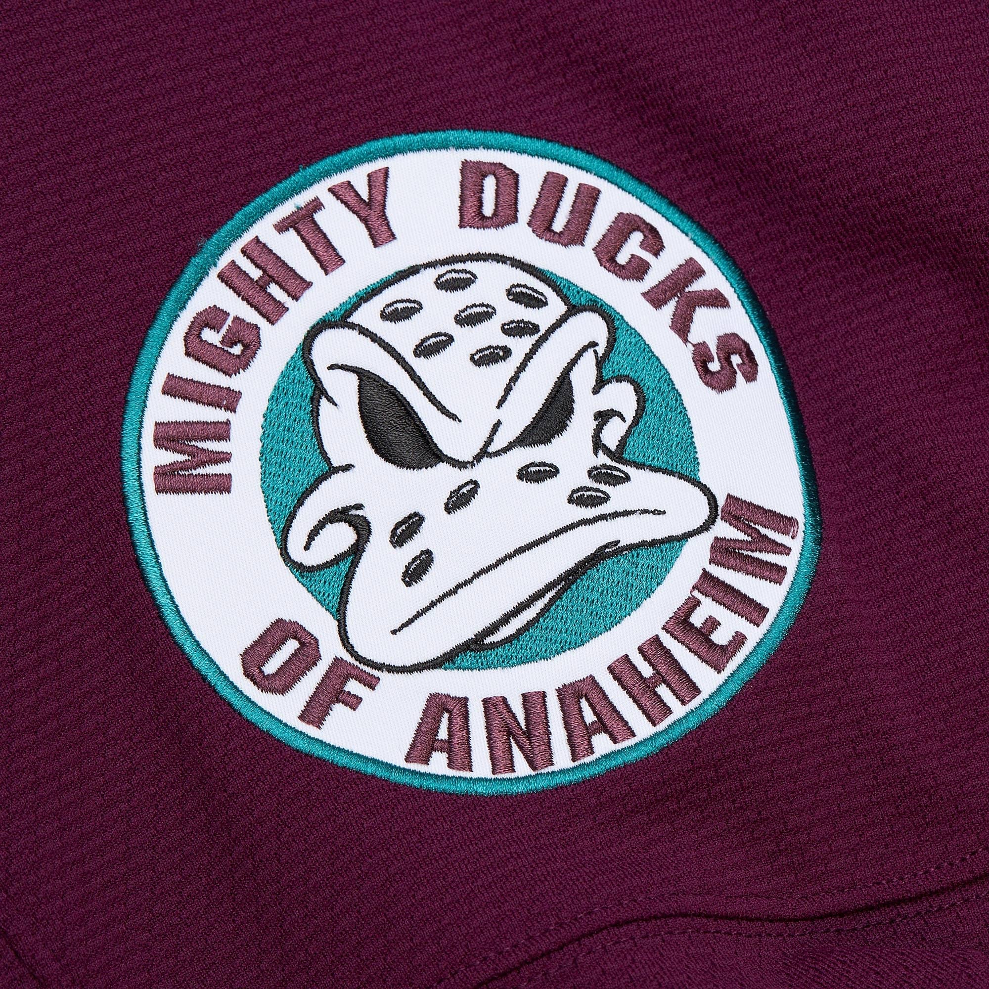- Ikonisches "Mighty Ducks"-Logo: Auf der Vorderseite des Trikots befindet sich das legendäre Torwartmasken-Logo mit gekreuzten Hockeyschlägern - ein Symbol, das die frühen Jahre der Ducks repräsentiert.