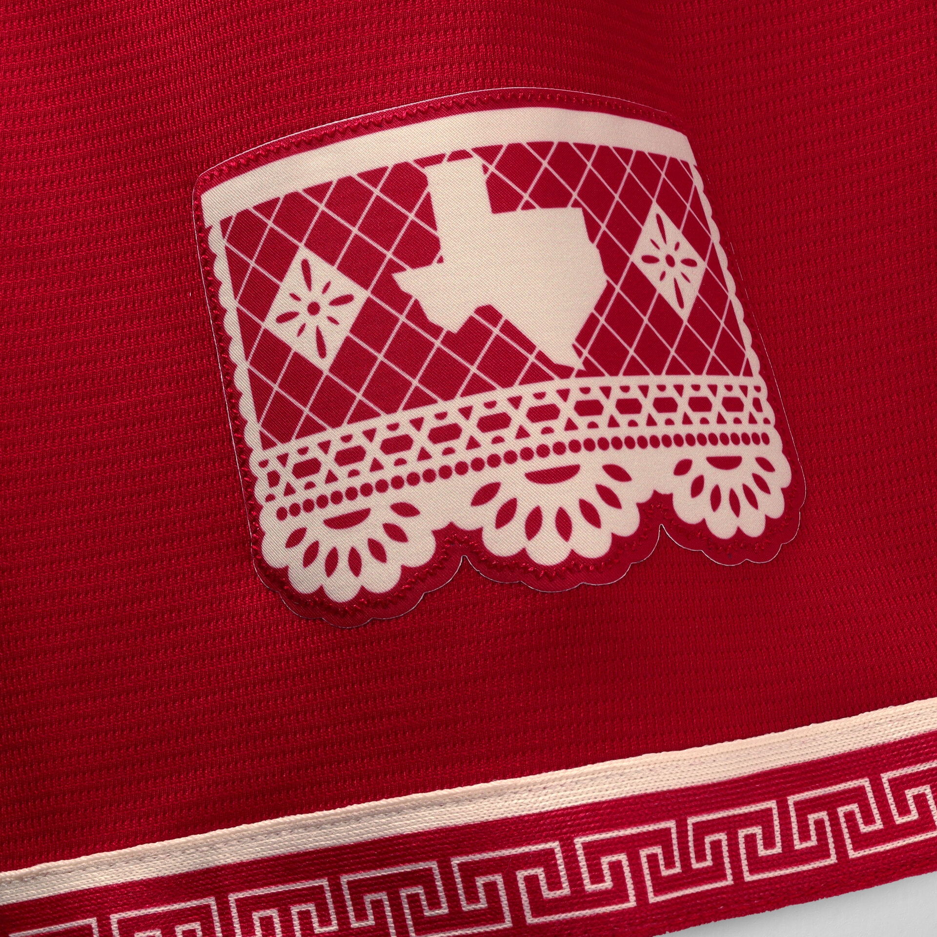 - Ärmel-Patch mit Texas-Umriss im traditionellen Papel-Picado-Stil