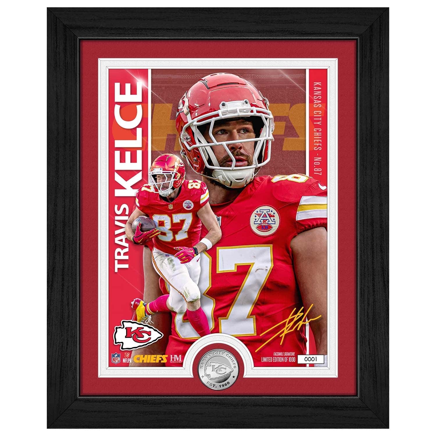 Highland Mint NFL gerahmtes Bild von Kansas City Chiefs Superstar Travis Kelce im Artist Proof Design mit Gedenkmünze.
