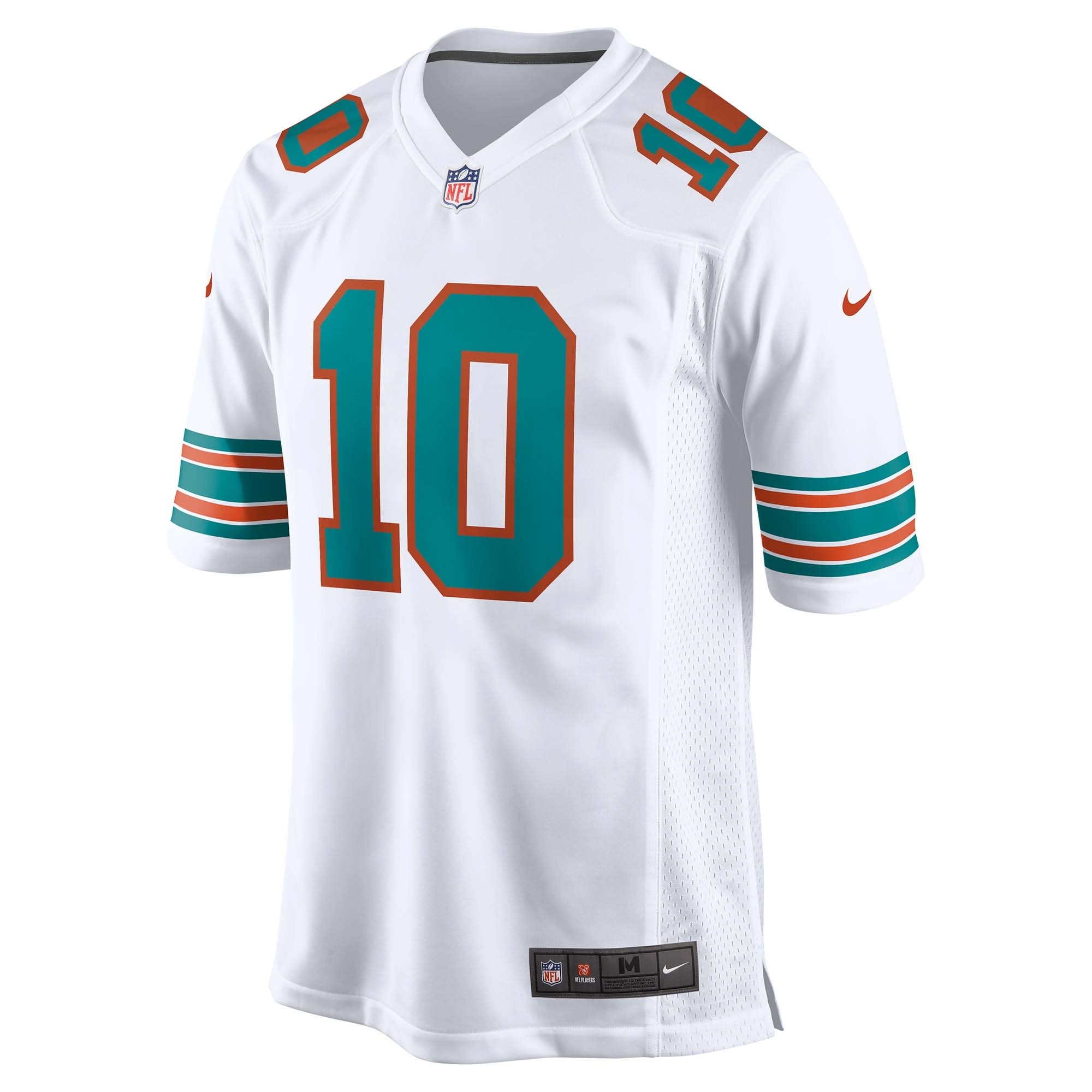 Das klassisch weiße Trikot ist auf den Ärmeln mit den Retro Miami Dolphins Teamstreifen bedruckt. Die Mesh-Einsätze, der Nackenbereich ohne störendes Etikett und eine lockere Passform sorgen immer für ein trockenes, angenehmes Tragegefühl und den authentischen Look der Spielfelduniform. Egal ob am Spieltag oder im Alltag - Mit deinem Tyreek Hill Miami Dolphins Trikot zeigst Du ganz klar welches Team Du unterstützt: Go Fins!