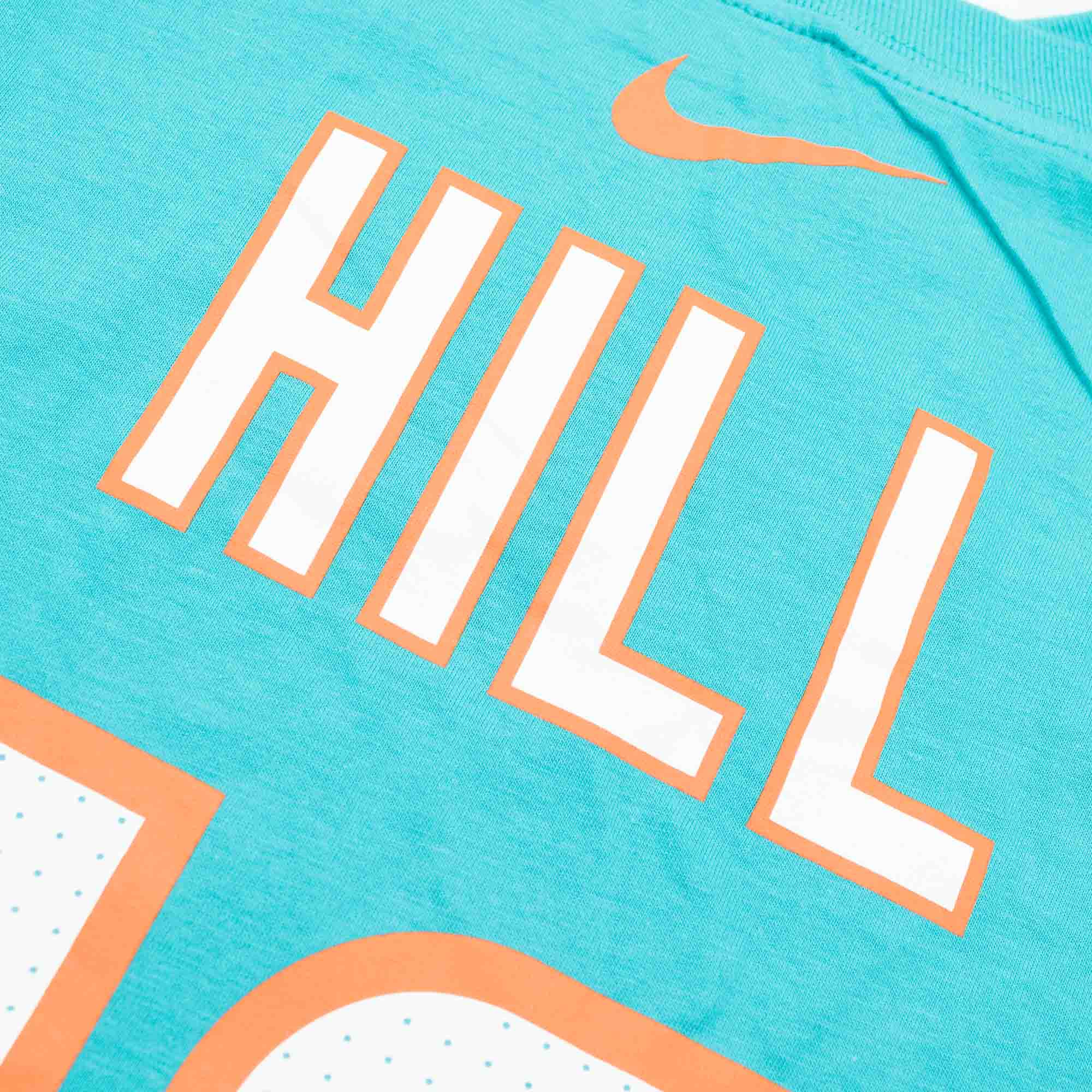 Offiziell lizensiertes Nike Cotton NFL Player Tee mit aufgedruckten Logos und Schriftzügen im originalen Trikotdesign. Auf der Vorderseite sind das Miami Dolphins Teamlogo und die Spielernummer 10 aufgedruckt. Die Rückseite ist mit dem Nike Swoosh Logo, dem Spielernamen (HILL) und der Spielernummer (10) bedruckt.